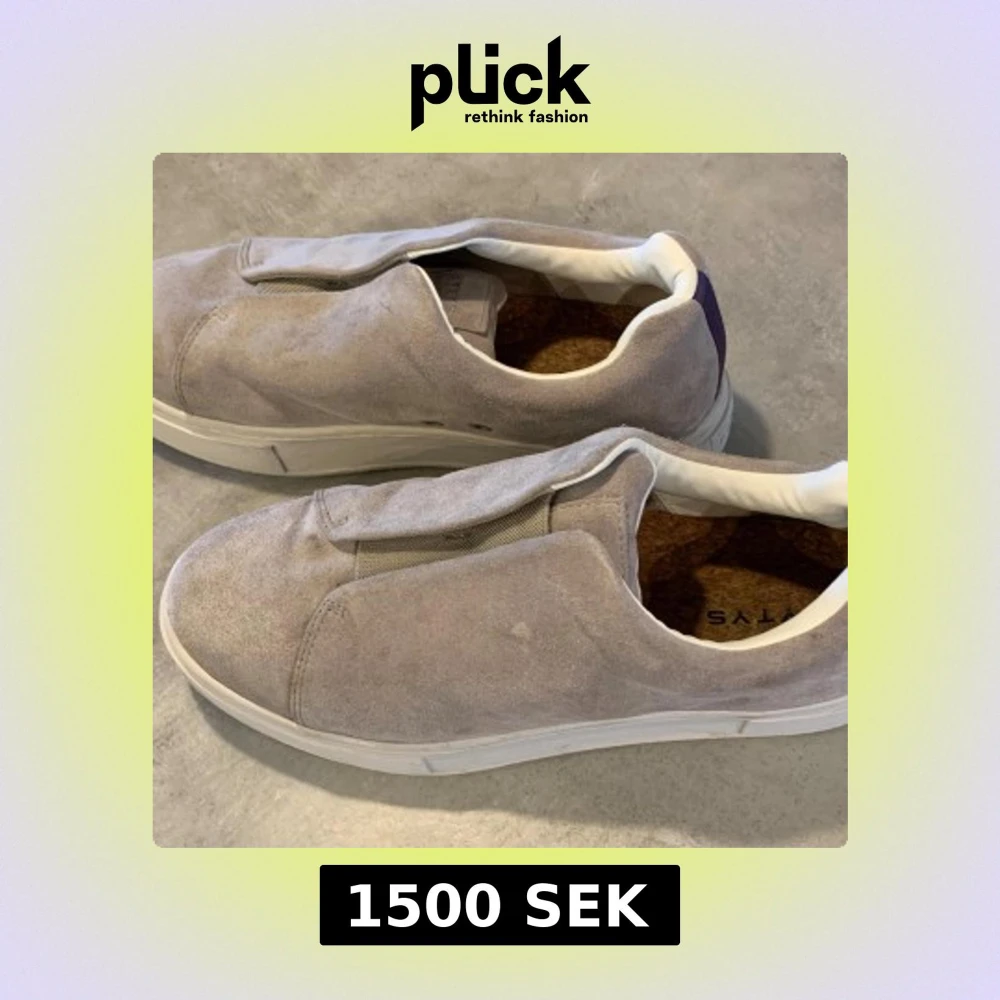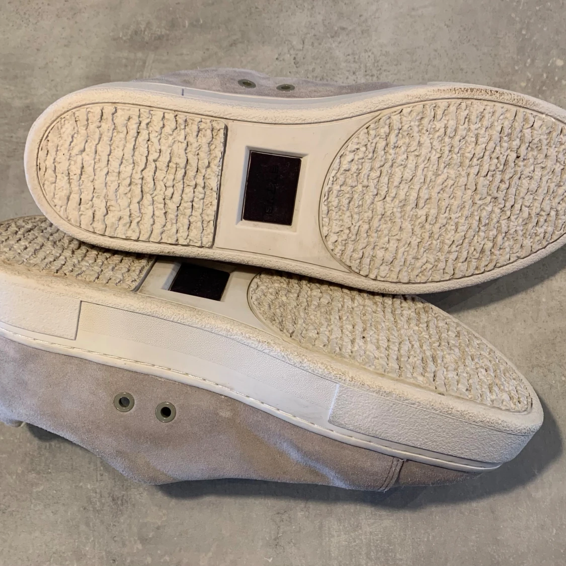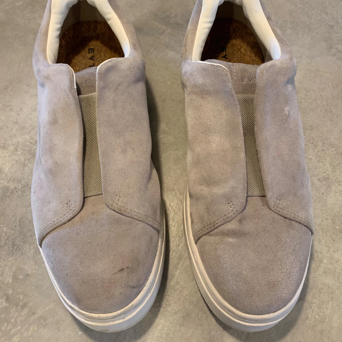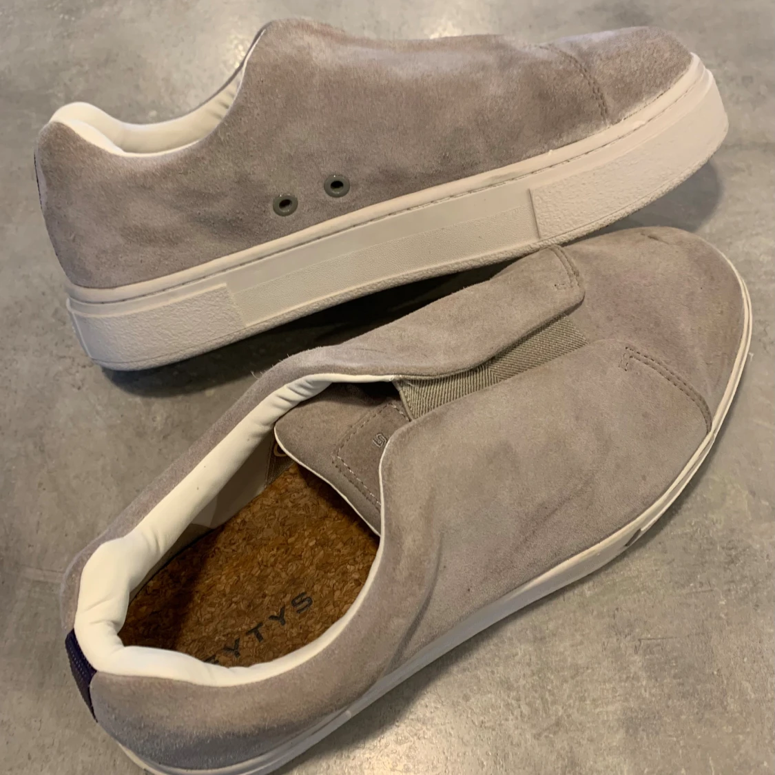 Snygga sneakers från EYTYs i ljusgrå mocka med vit sula och diskret elastisk detalj framtill. Skorna har en minimalistisk design, rund tå och bekväm innersula i kork. Perfekta för dig som gillar stilrena och cleana sneakers. Använda vid två tillfällen. Nypris 2200kr