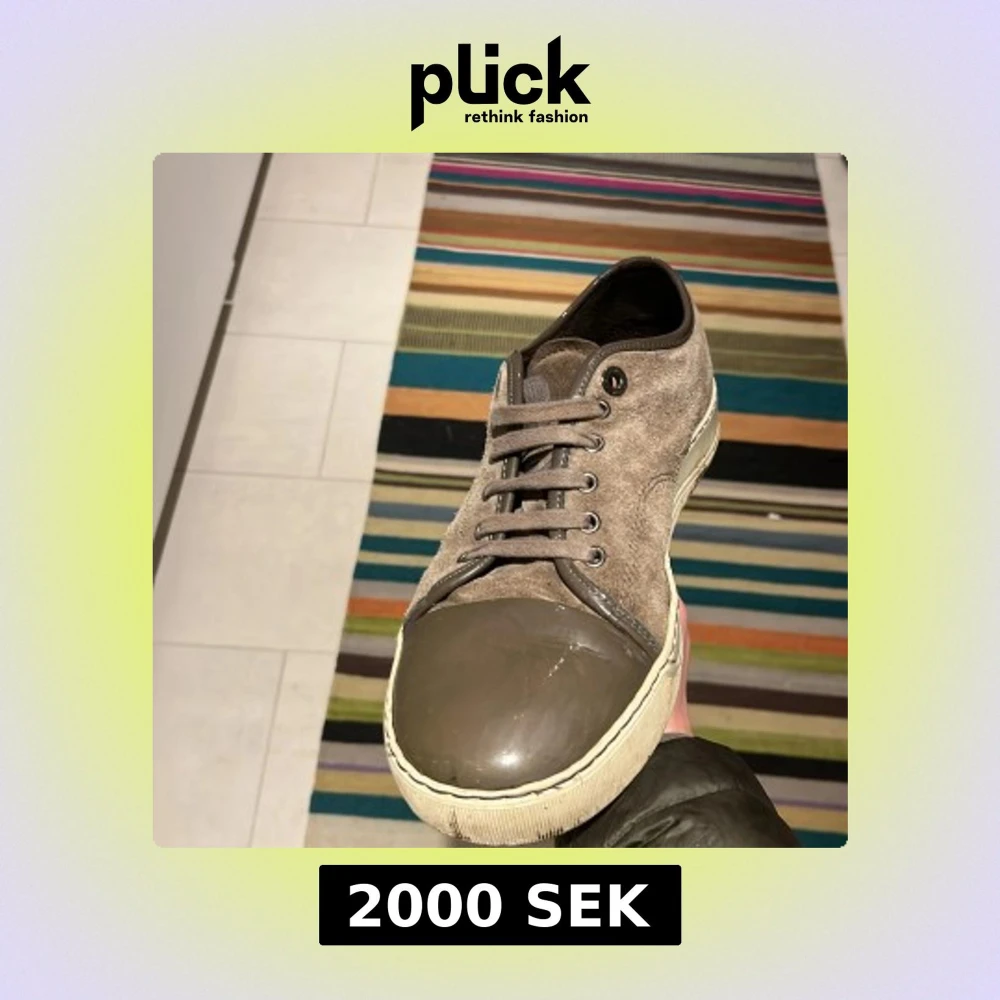 Snygga sneakers från Lanvin i grå mocka med glansig tå i mörkgrått och matchande snörning. Skorna har en vit sula och diskreta detaljer i lack. Perfekta för dig som gillar stilrena och exklusiva sneakers med en twist. Tvättar innan jag skickar dom, passar 42.