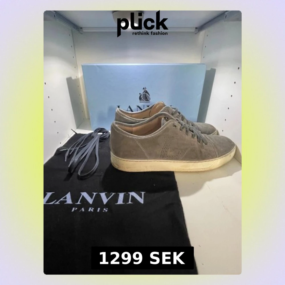 Snygga grå sneakers från Lanvin i mjuk mocka med vit platt sula och rund tå. Skorna har klassisk snörning och diskret perforerat L på sidan. Innersulan är i beige skinn och de kommer med extra skosnören och originalpåse i och låda. TAR BYTEN‼️