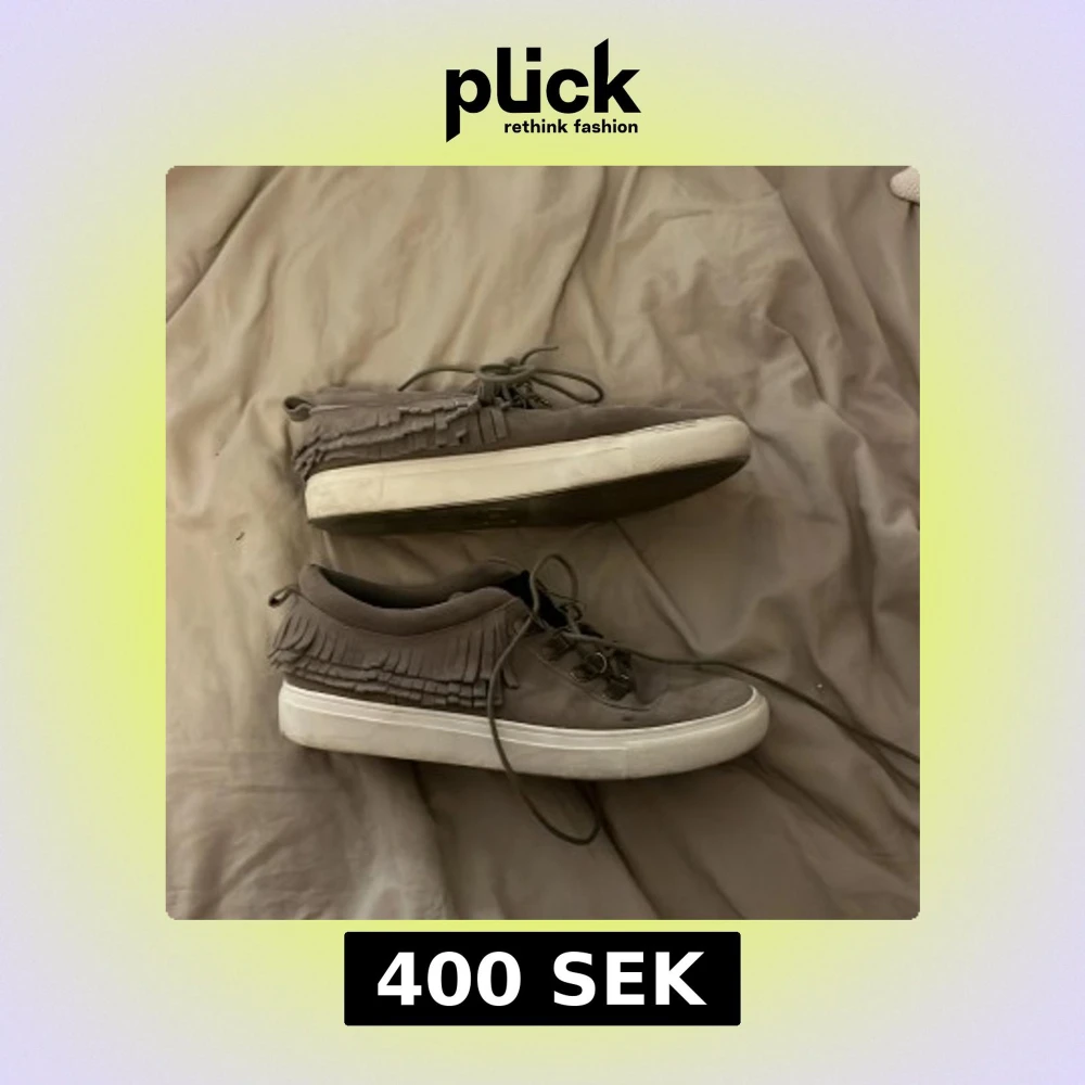 Säljer ett par grå sneakers från Kurt Geiger i mocka med snygga fransdetaljer runt ankeln. Skorna har snörning och en vit platt sula som ger en stilren look. Perfekta för dig som vill ha något unikt och trendigt i garderoben