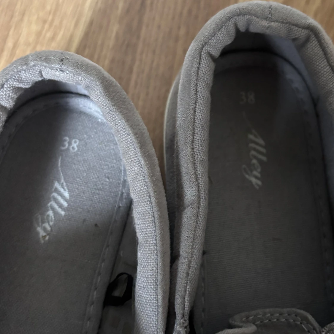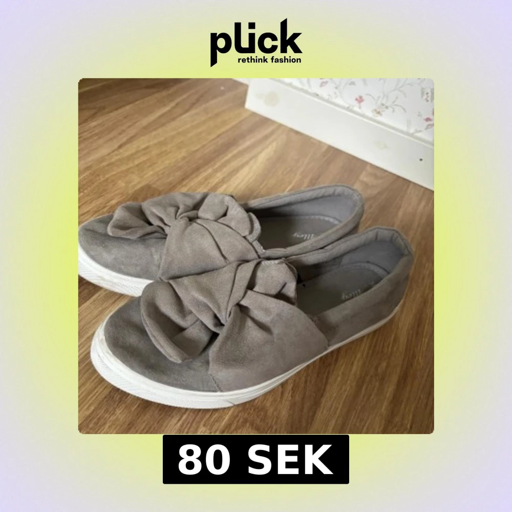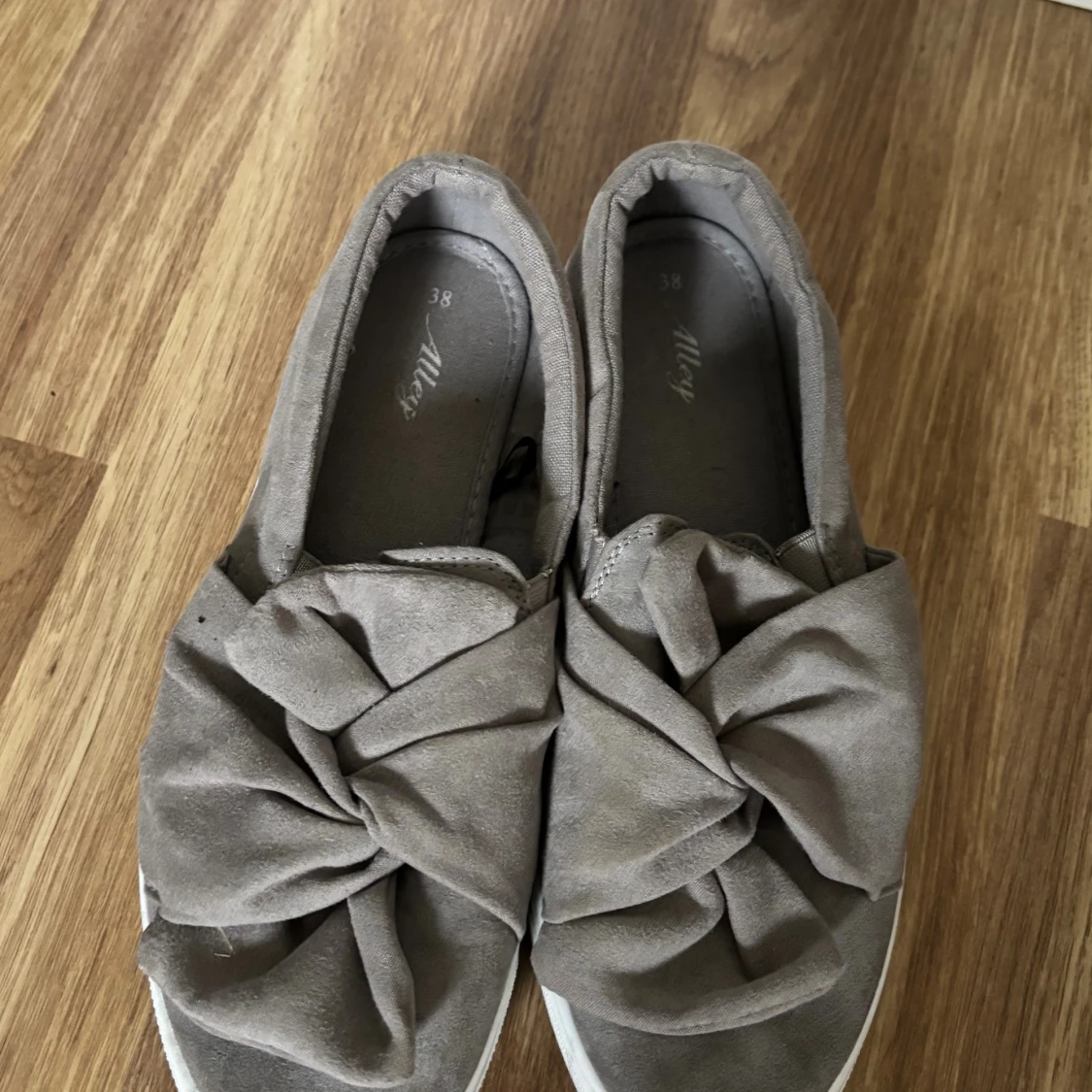 Snygga grå sneakers från Alley i mockaimitation med stor rosettdetalj framtill. Skorna har vit platt sula och rund tå, vilket ger en chill och trendig look. Perfekta att slänga på sig till jeans eller kjol för en avslappnad stil. Använda några gånger köpta på skopunkten💕