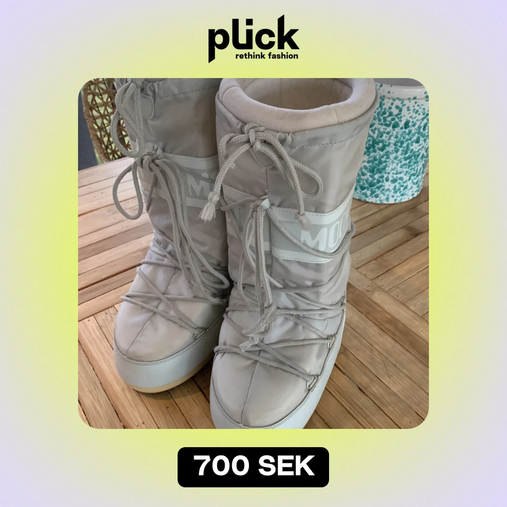 Säljer ett par snygga och varma beige Moon Boots i syntetmaterial. Perfekta för vintern med sin rejäla snörning och vadderade insida. De har en cool och futuristisk look som verkligen sticker ut. Passar perfekt för kalla dagar när du vill hålla fötterna varma och torra. Stl 35-38.