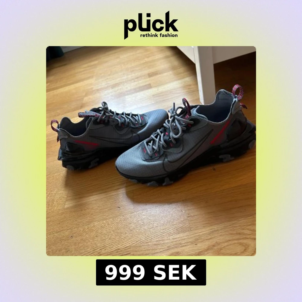 Box följer med skorna är som nya. Säljer ett par grå Nike React sneakers med svarta och röda detaljer. Skorna har snörning, skorna är perfekt för sommaren luftiga och jätte sköna att gå i jag har max använt dom tre gånger bara