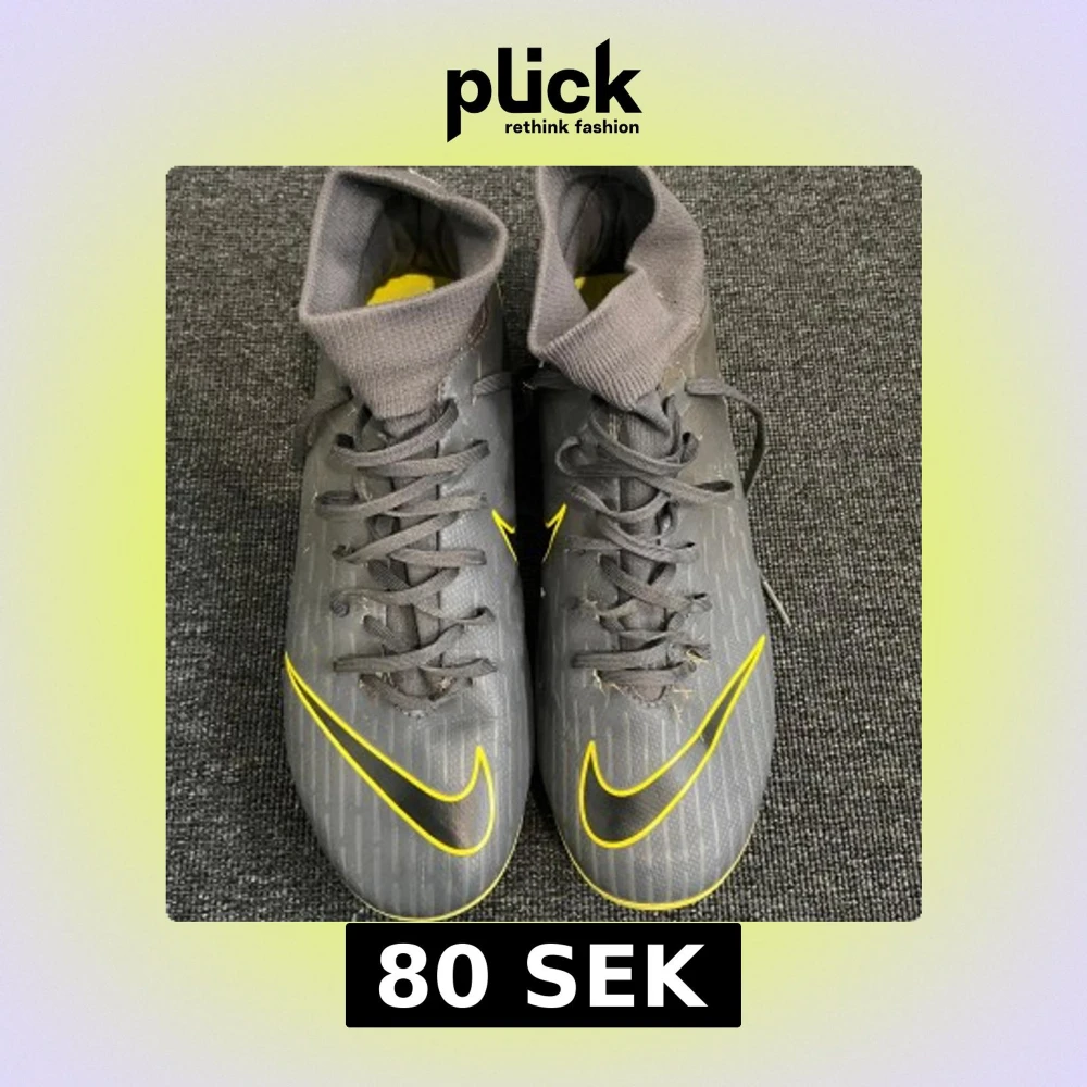Säljer ett par grå fotbollsskor från Nike med gula detaljer . Skorna har en strumpliknande krage för extra stöd och en slitstark sula med dobbar för bra grepp på planen. Perfekta för fotbollsträning och matcher.