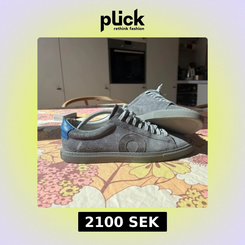 Snygga sneakers i grå mocka med diskret cirkeldetalj på sidan och blå häl. Skorna har grå snörning och platt sula i matchande grått. Perfekta för dig som gillar stilrena och moderna skor med en twist. Storlek 42 knappt använda