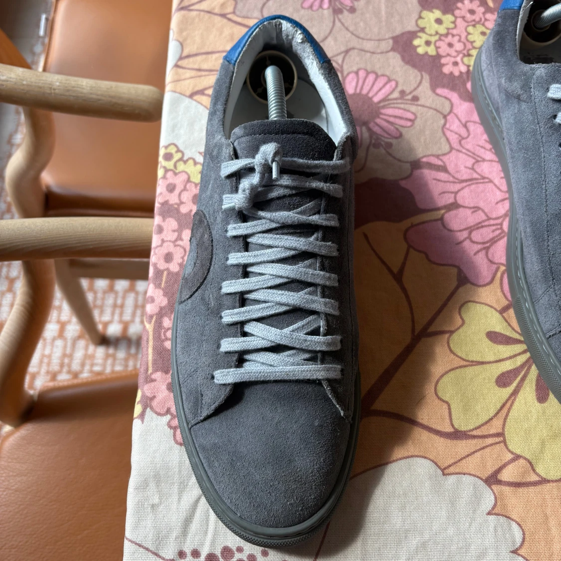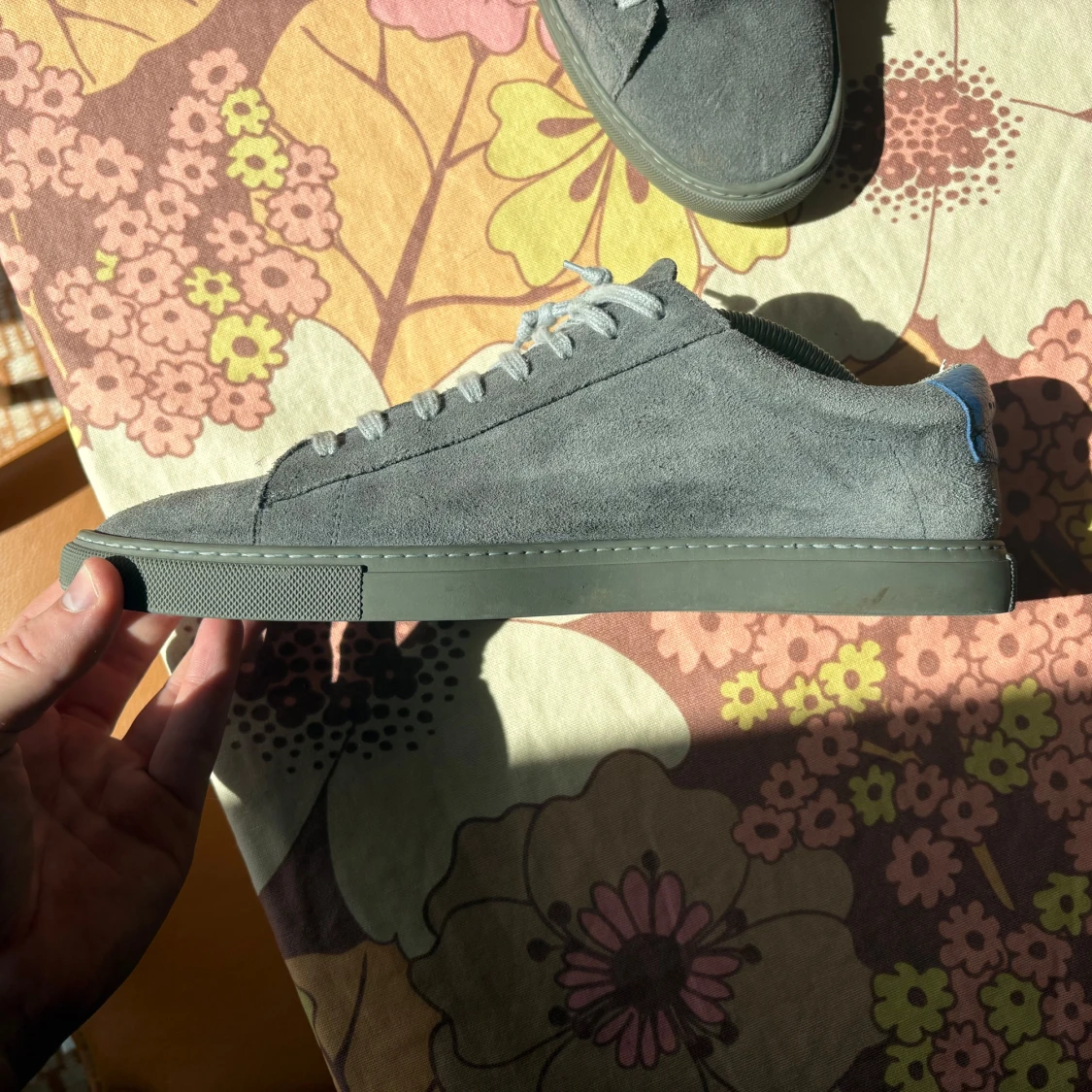 Snygga sneakers i grå mocka med diskret cirkeldetalj på sidan och blå häl. Skorna har grå snörning och platt sula i matchande grått. Perfekta för dig som gillar stilrena och moderna skor med en twist. Storlek 42 knappt använda