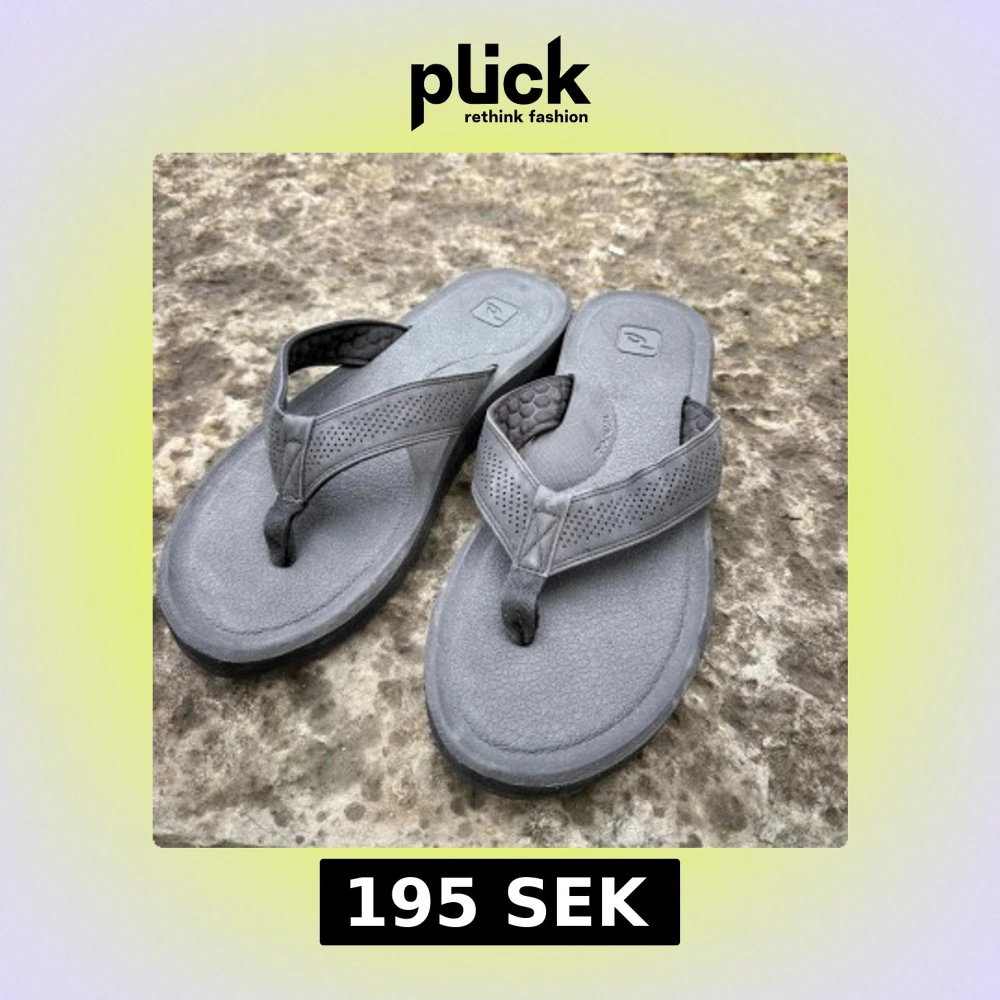 Säljer ett par grå sandaler från Rip Curl i storlek 45. De har en klassisk flip-flop design med perforerade remmar och mönstrad innersula för extra komfort. Materialet är syntet och sulan har vågigt mönster undertill. Perfekt för sommaren!