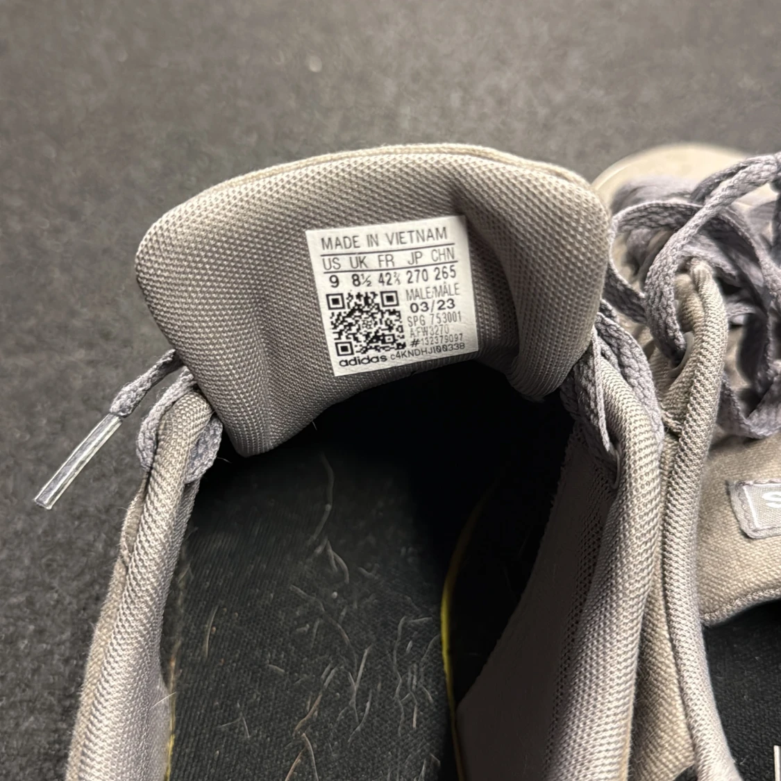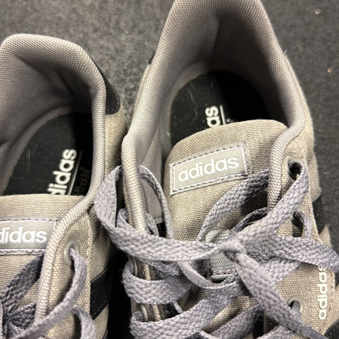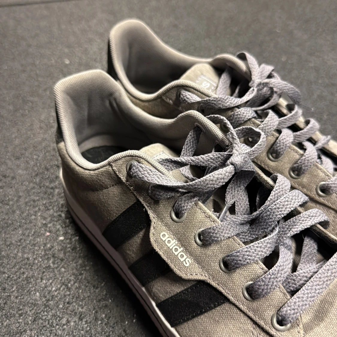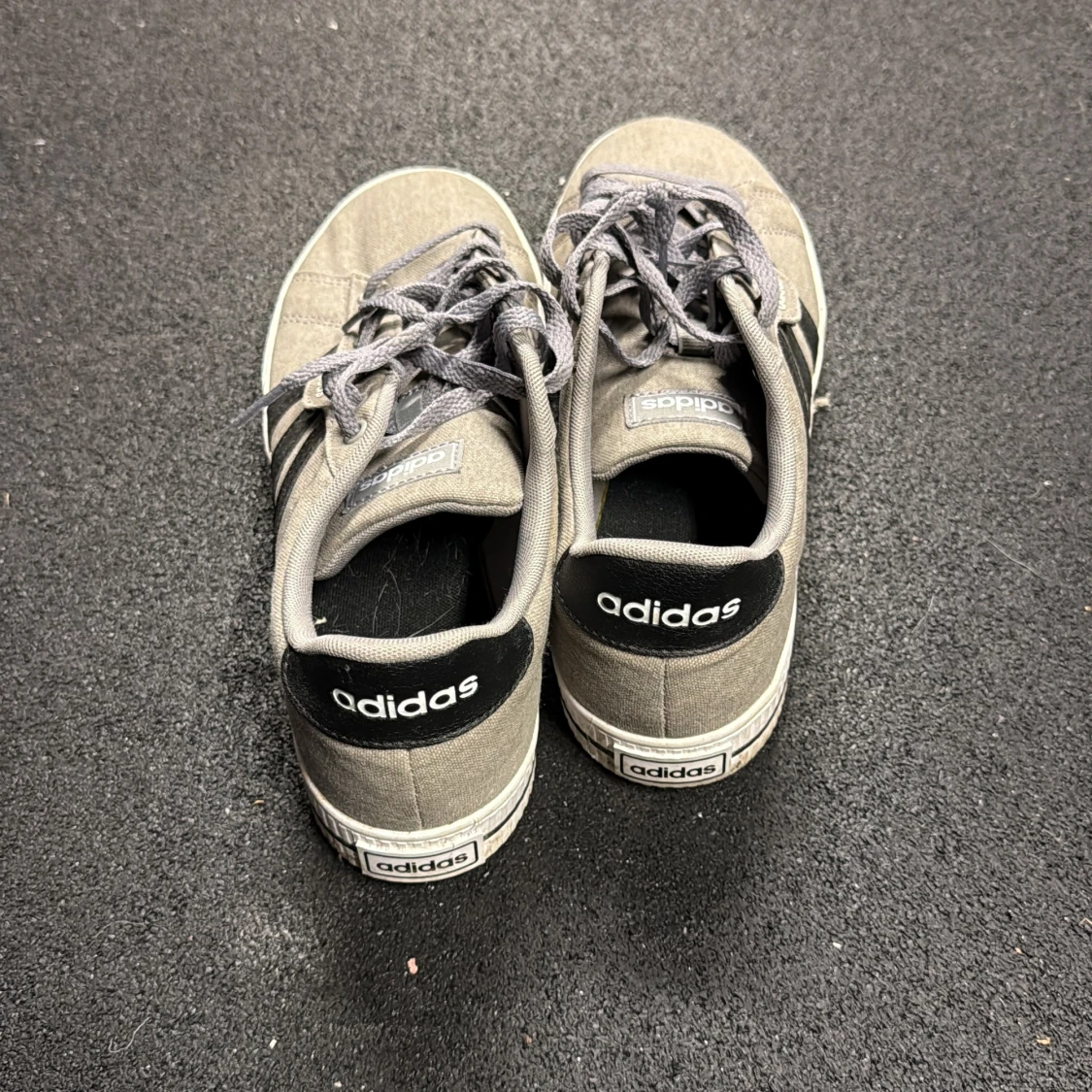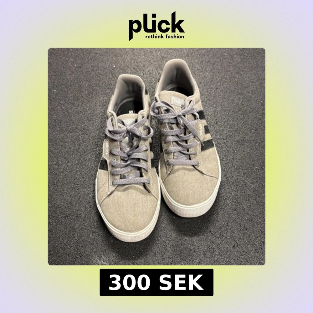 Snygga grå sneakers från Adidas med klassiska svarta ränder på sidorna och vit sula. Skorna har snörning och är tillverkade i textilmaterial. Perfekta för dig som gillar en clean och stilren look till vardags. Inköpta 2023 i USA, sparsamt använda pga fel storlek.