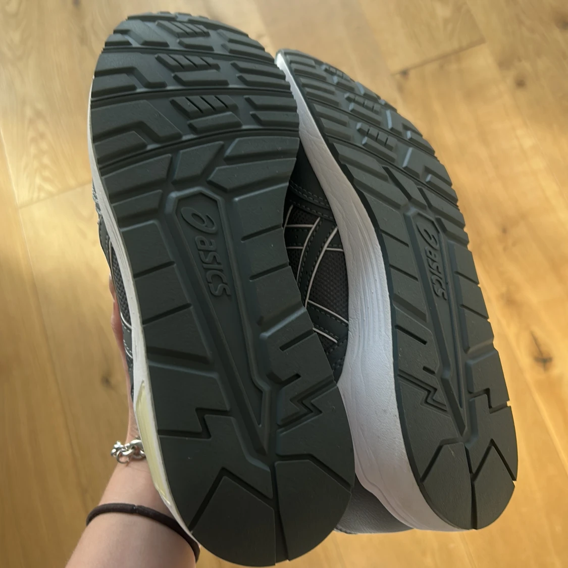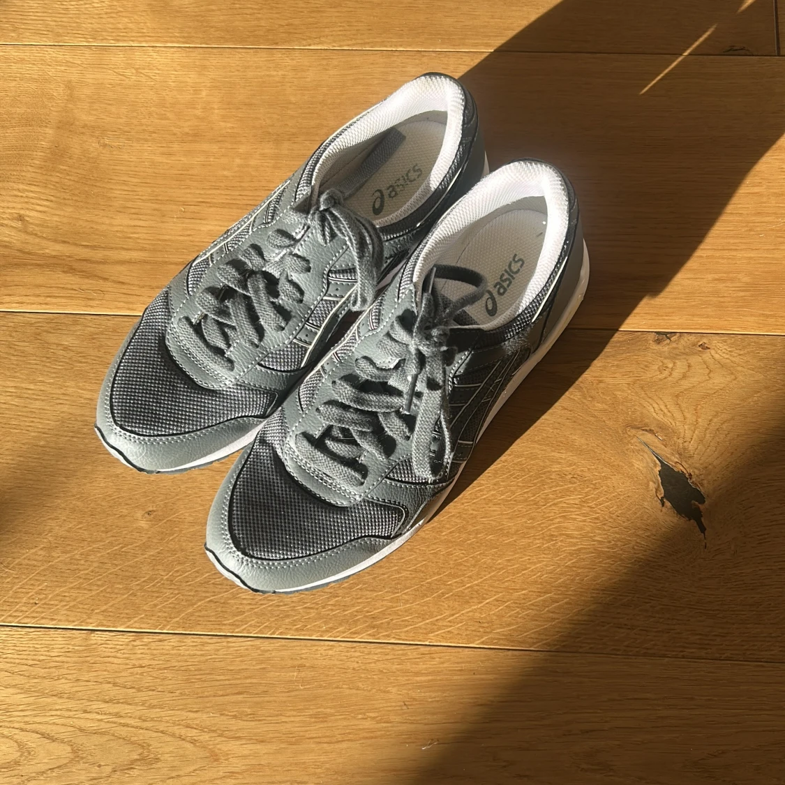Snygga grå sneakers från Asics med vita detaljer och klassisk logga på sidan. Ovandelen är i mesh och syntet för bra andningsförmåga och komfort. Skorna har snörning och en rejäl, mönstrad sula som ger bra grepp. Perfekta för dig som gillar sportig stil.