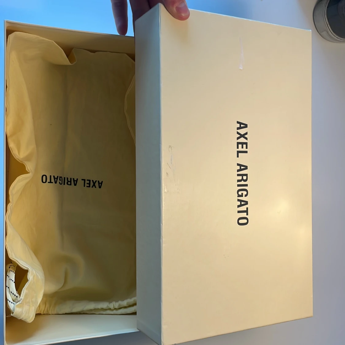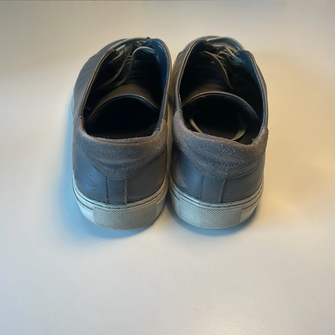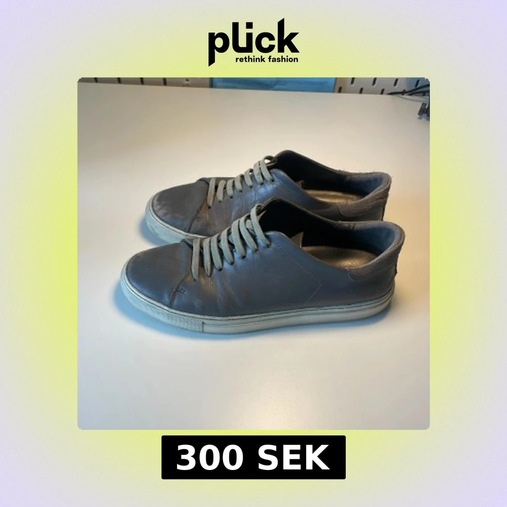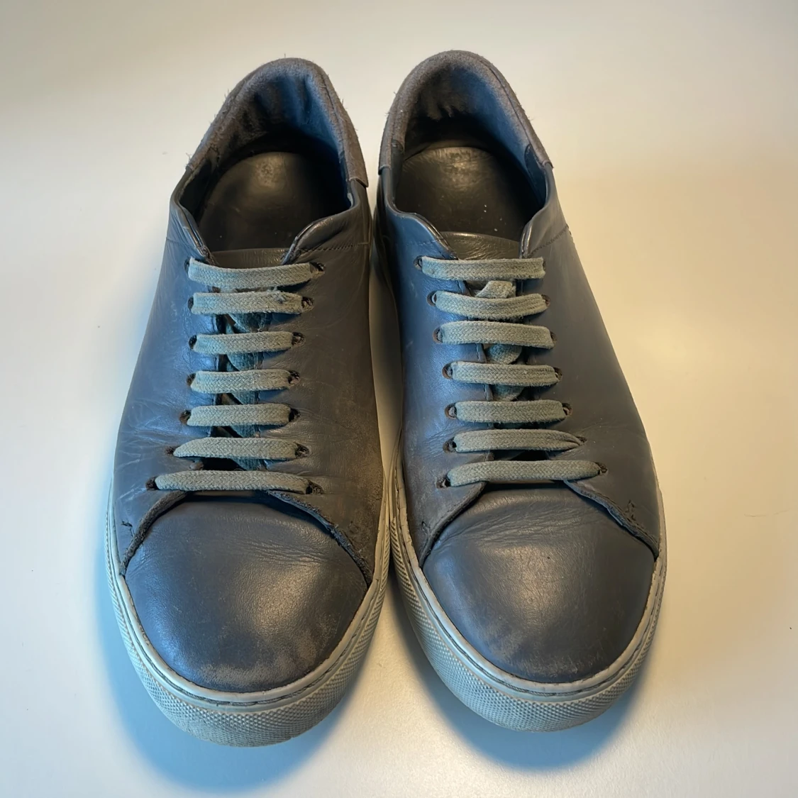 Säljer ett par stilrena grå sneakers från Axel Arigato med vit platt sula och klassisk snörning. Skorna har en rund tå och är tillverkade i skinn. Box och påse följer med.