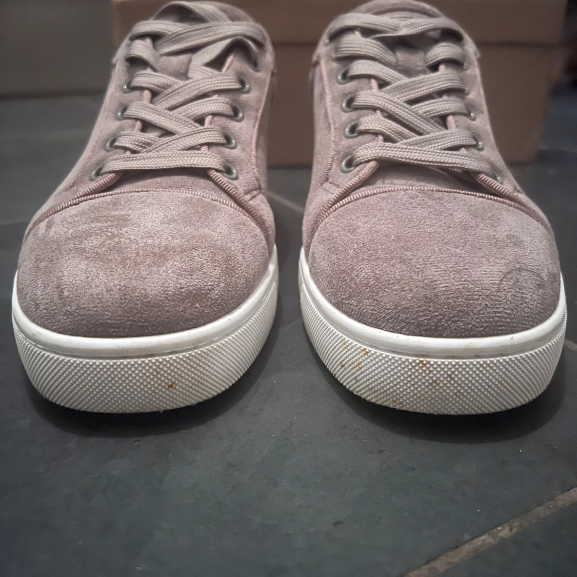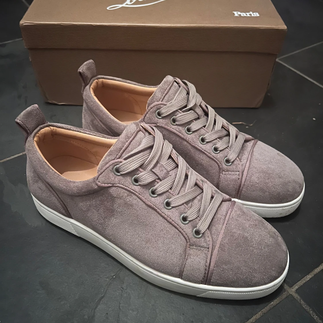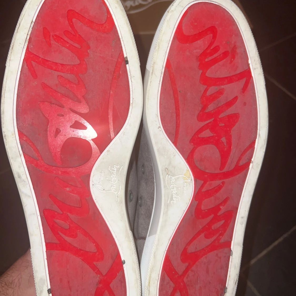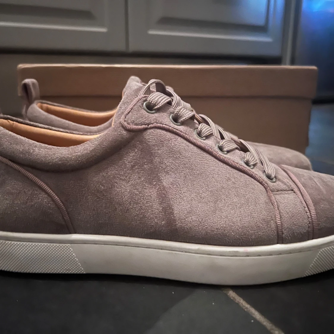 Snygga grå sneakers i mocka från Christian Louboutin med den ikoniska röda sulan. Skorna har snörning och en stilren design som passar perfekt för en trendig look. De har en vit sula som kontrasterar snyggt mot det grå mockamaterialet.