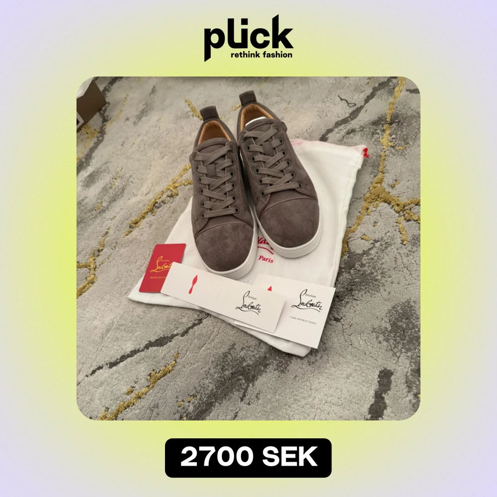 Säljer ett par snygga grå sneakers från Christian Louboutin i mocka. De har den ikoniska röda sulan och snörning framtill. Perfekta för både vardag och fest! Skorna är i nytt skick och kommer med originalpåse och kort samt låda.