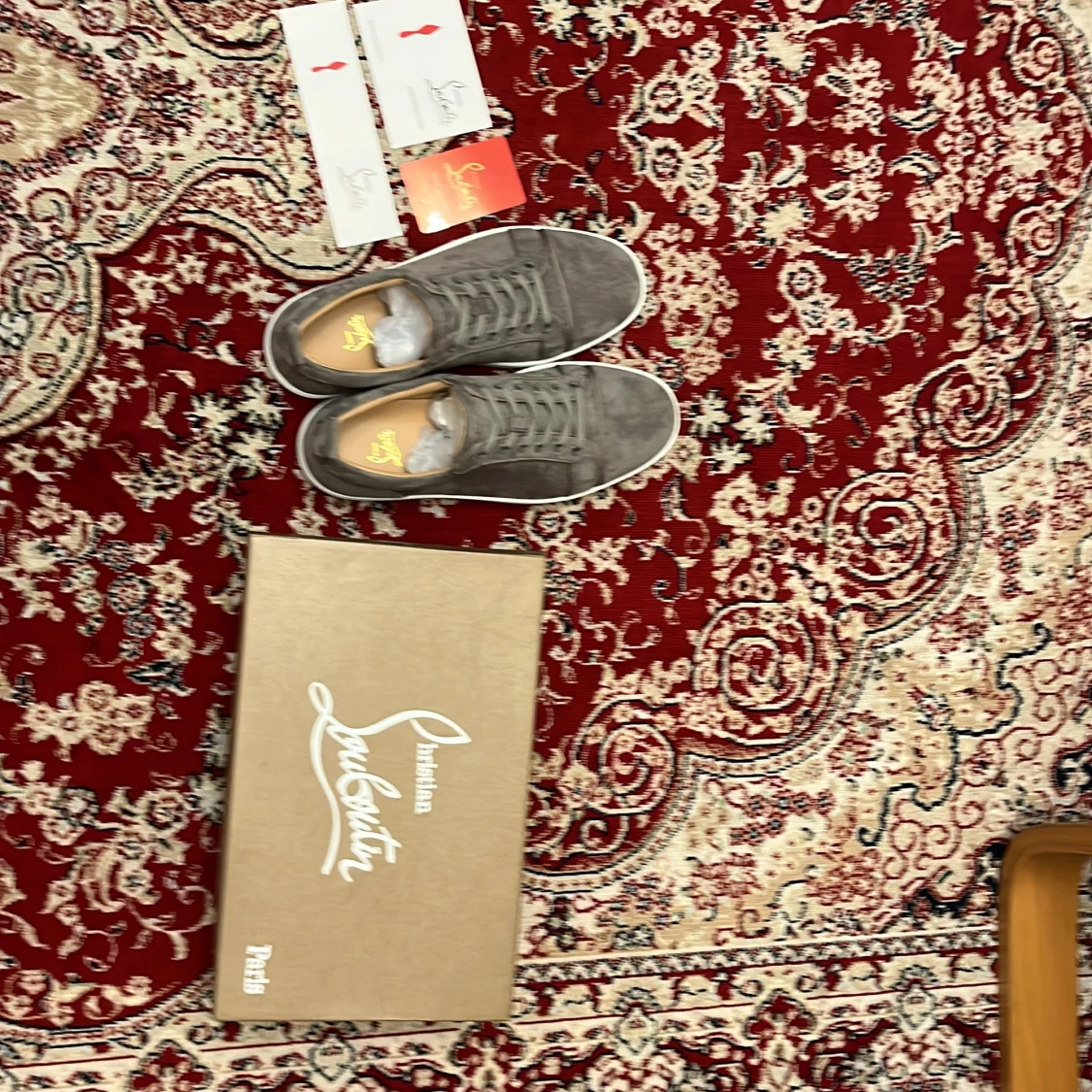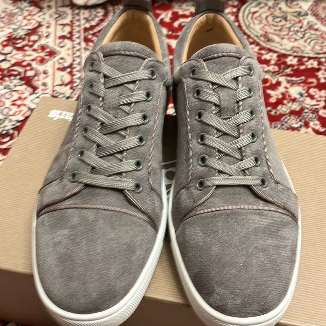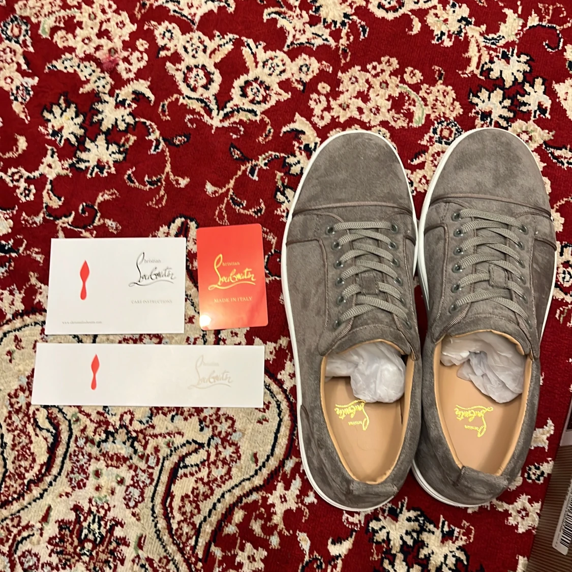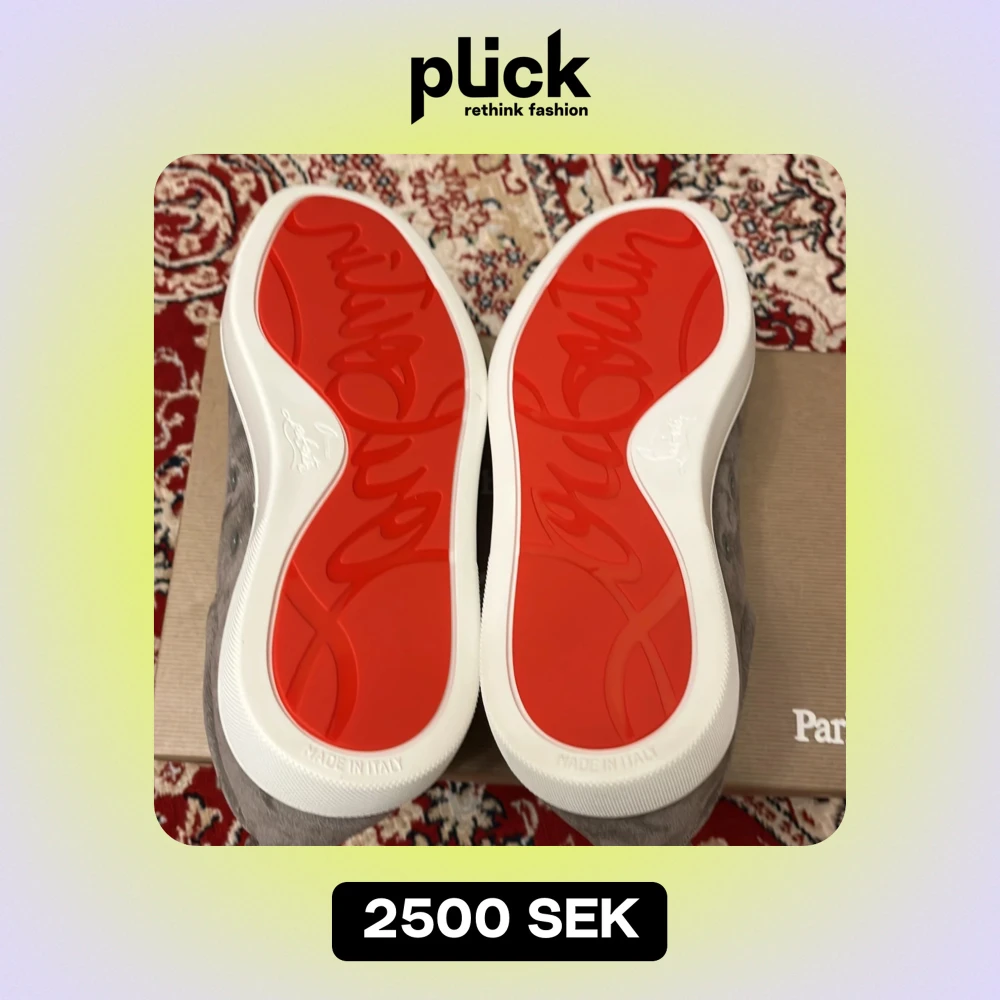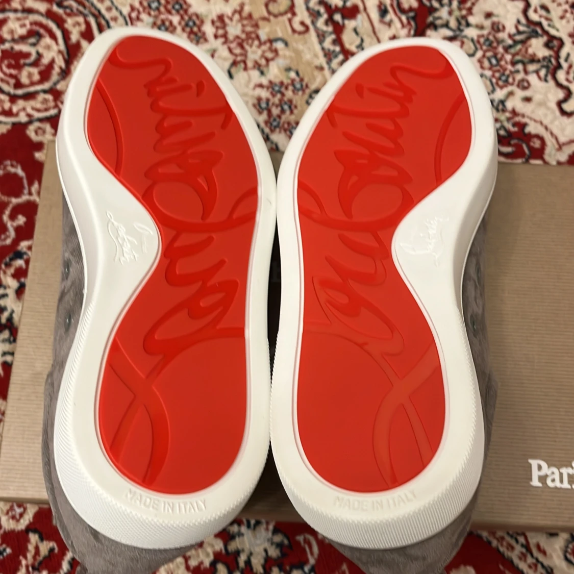 Säljer ett par snygga grå sneakers från Christian Louboutin i mocka. De har den ikoniska röda sulan och är i mycket bra skick. Perfekta för både vardag och fest! Skorna har snörning och en stilren design som passar till det mesta.