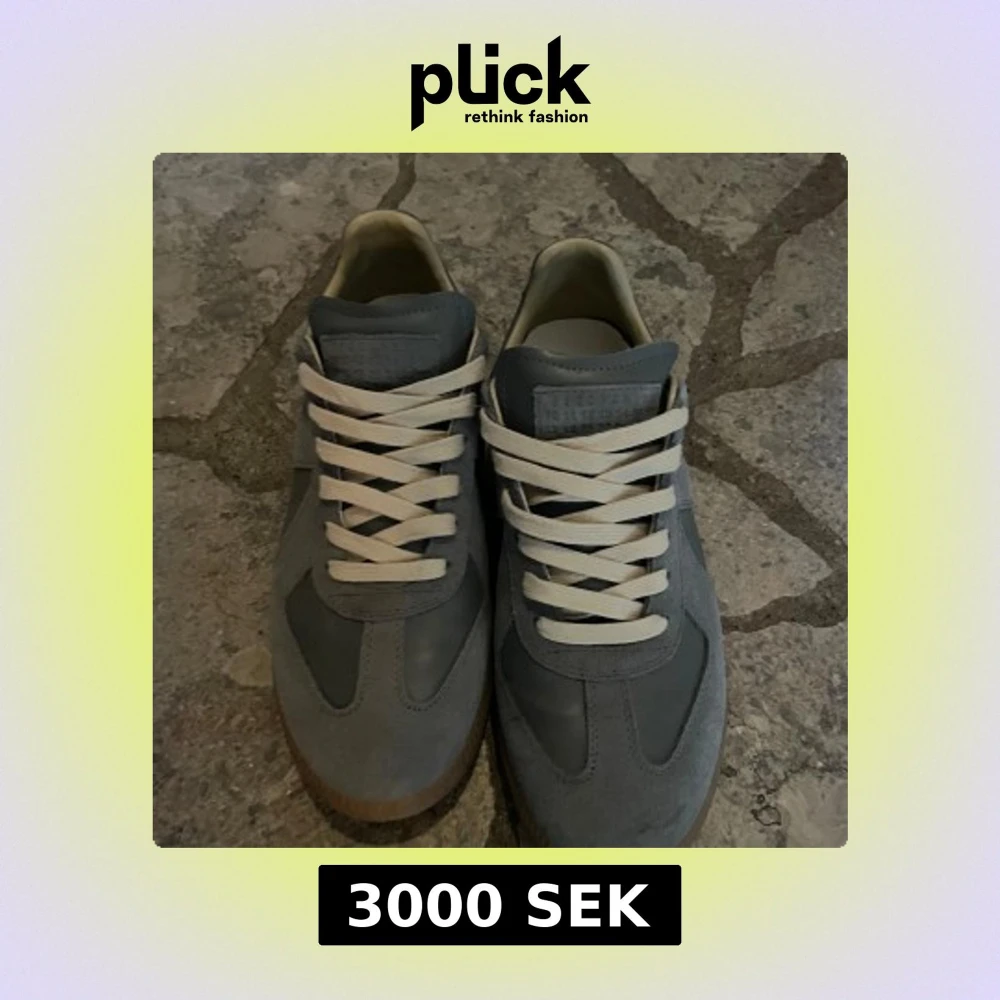 Säljer ett par grå Maison Margiela sneakers med vita snören. Skorna har en klassisk design med paneler i mocka och skinn, samt rund tå. Perfekta för dig som gillar stilrena och tidlösa sneakers. Skorna är i storleken 43 men passar utmärkt till 42. OBS! Har inget kvitto tyvärr slängde det