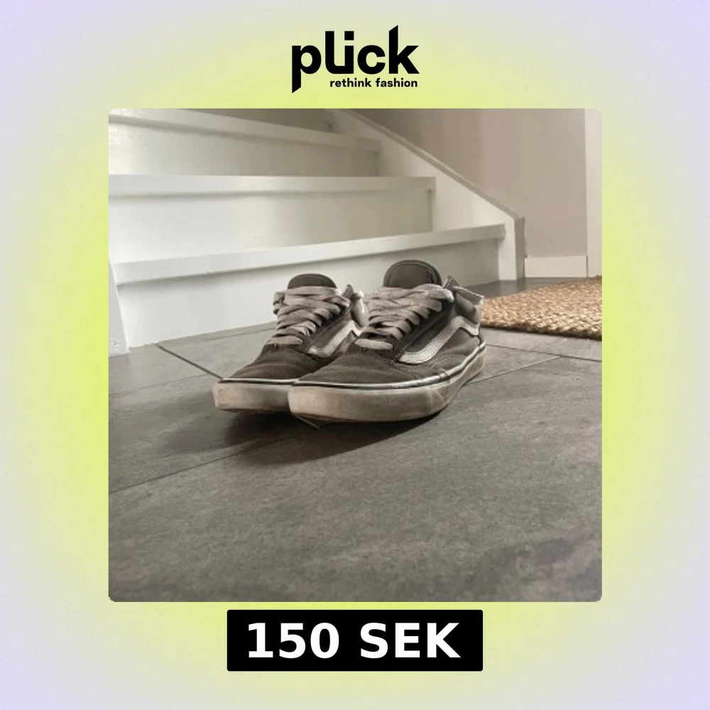 Säljer ett par klassiska grå sneakers från Vans med vit sula och snörning. Skorna har den ikoniska sidostripen i vitt och är perfekta för en avslappnad stil.