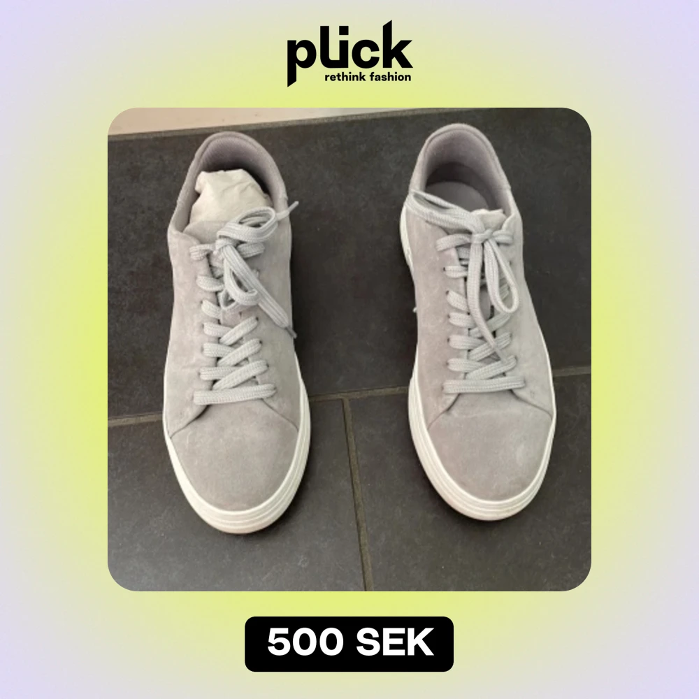 Säljer ett par snygga grå sneakers i mocka. De har en klassisk design med snörning och en vit sula som ger en fräsch look. Perfekta för vardagsbruk och passar till nästan alla outfits. Skorna är i bra skick och har knappt använts. Köp dem nu och ge din skogarderob en stilren uppdatering!