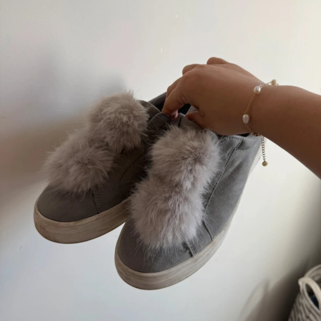 Säljer ett par grå sneakers med fluffiga pälsdetaljer på ovansidan. Skorna har platt sula och rund tå, vilket gör dem både snygga och bekväma. Pälsen är ljusgrå och ger en unik och trendig look. Perfekt för dig som vill sticka ut med dina skor.