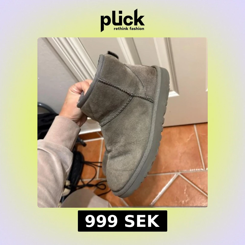 Säljer ett par klassiska UGG boots i grå mocka med rund tå och platt sula. Insidan är fodrad med mjuk päls som håller fötterna varma. Bootsens design är enkel och tidlös, med UGG-logga baktill och grov yttersula för extra grepp. De är tyvärr ej lika fkuffiga vid häl och hälrygg men inga större defekter än så. Köpta i raglady på väla för 2000kr.Original låda tillkommer!!