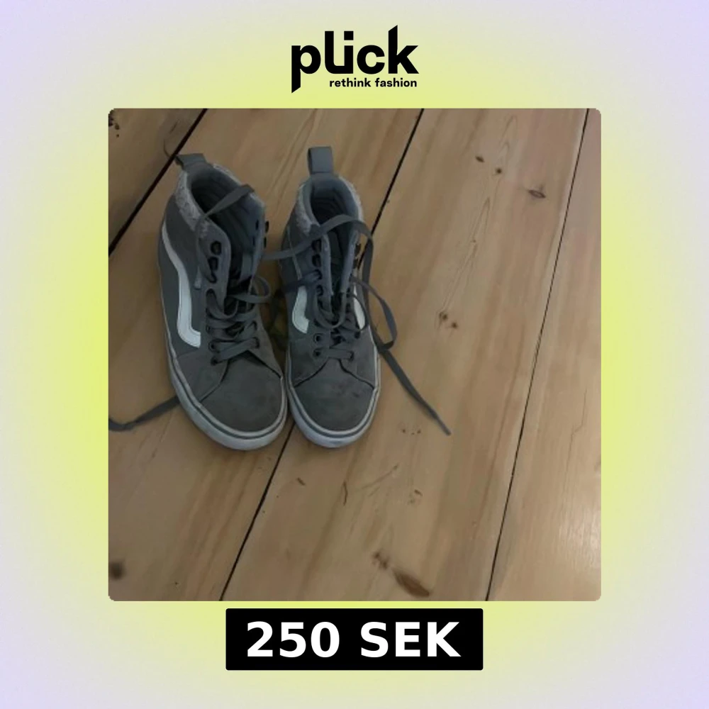 Säljer ett par grå höga Vans sneakers med vit sula och klassisk vit sidostrip. Skorna har snörning och är fodrade med mjukt material för extra värme. Perfekta för dig som vill ha en streetig look även under kallare dagar.