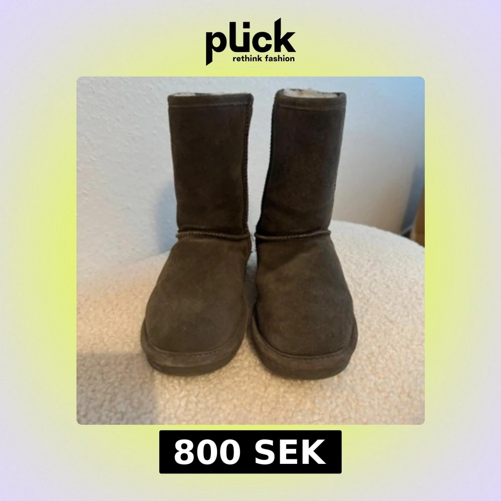 Säljer ett par gråa Bearpaw boots med rund tå och platt sula. Skorna är tillverkade i mjuk mocka och har en klassisk, enkel design med högt skaft. Insidan är fodrad för extra värme, perfekt för kyliga dagar. Märkeslogga bak på hälen. Använd en gång. Köpta i USA.