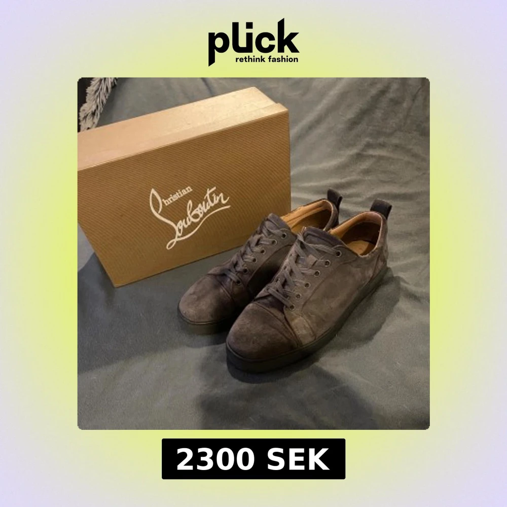 Säljer ett par grå skor från Christian Louboutin i lyxig mocka med klassisk röd sula. Skorna har rund tå, snörning och diskret design som passar till allt. Kommer med originalkartong, dustbag och äkthetskort. Perfekta för dig som gillar exklusiva detaljer. Sulan i hälen är lite sunkig annars fins skor passar till nästan allt, bara höra av sig vid funderingar