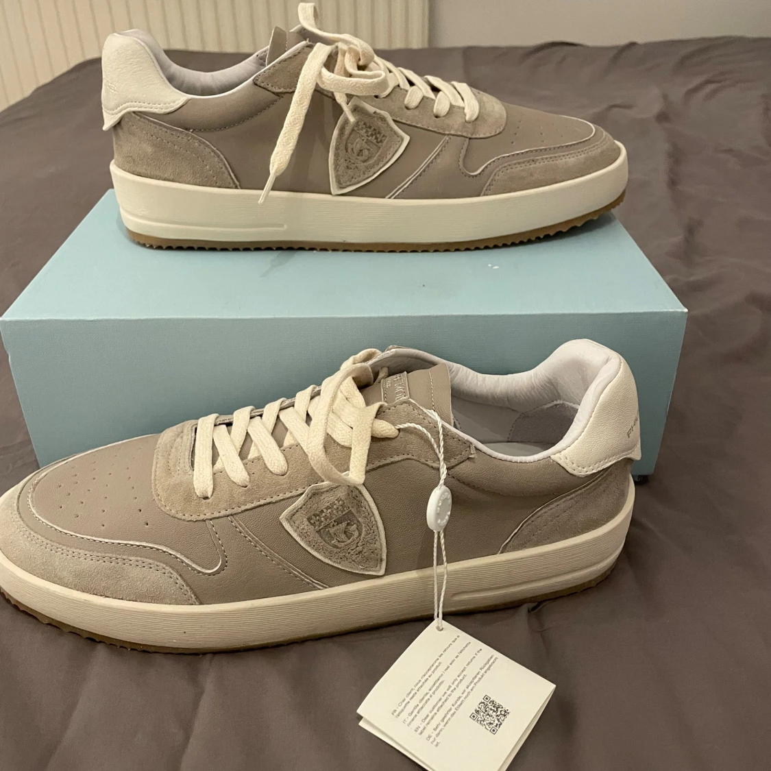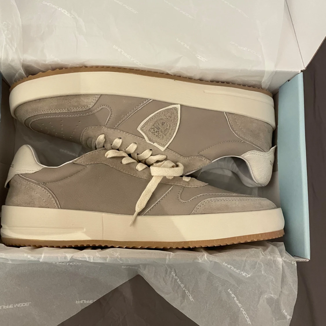Säljer ny mina snygga gråa sneakers från Philippe Model. Skorna har ovandel i mocka och skinn, vita snören och diskret logga på sidan. Platt sula i vitt och gummi. Nypriset är ca 3200. Skorna är helt nya och har storlek 44. Priset är inte hugget i sten och om det finns några frågor är det bara att skriva!/Erik