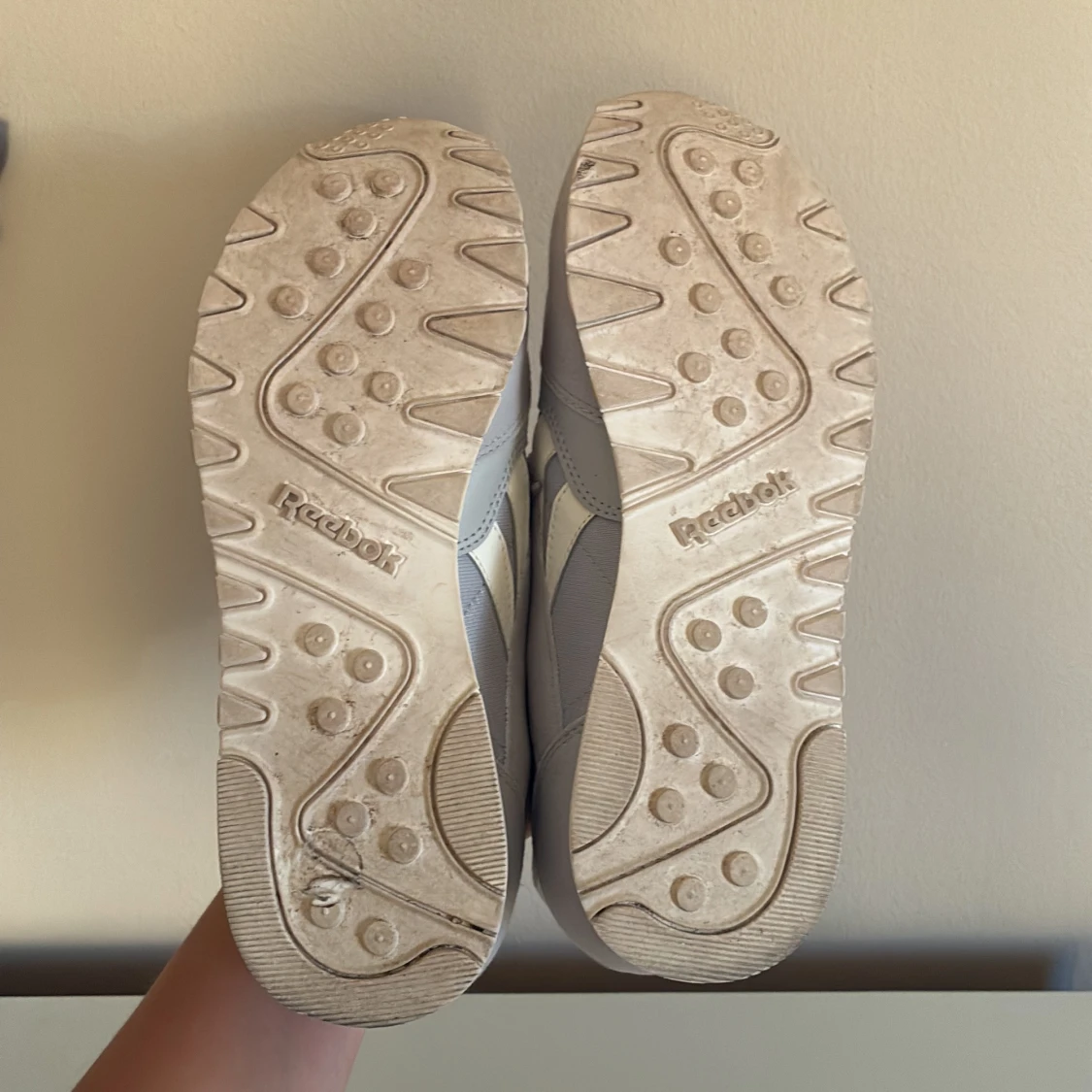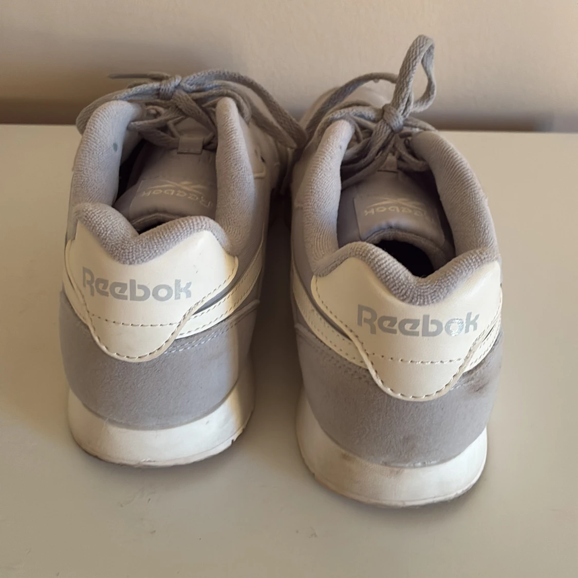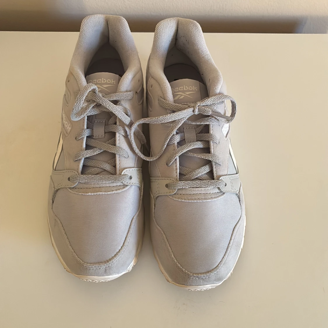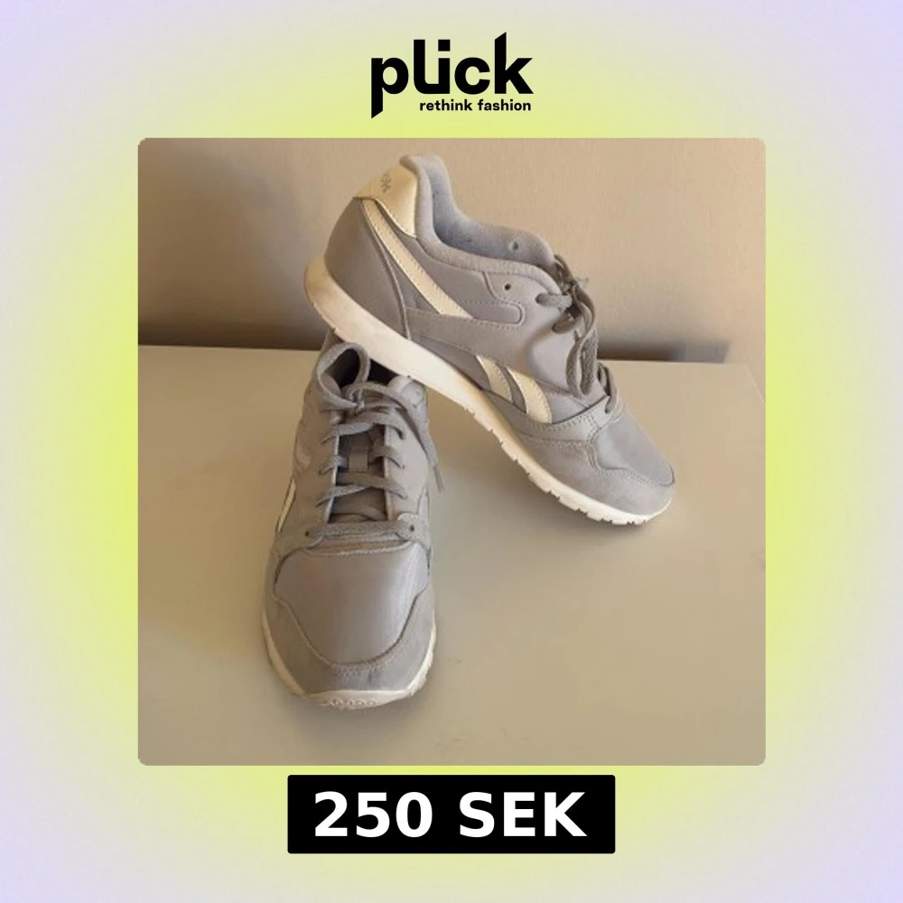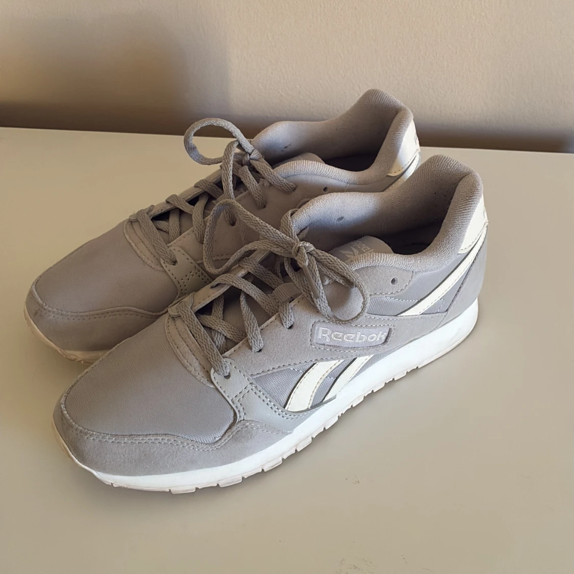 Snygga grå sneakers från Reebok med vita detaljer och logga på sidan och hälen. Skorna har snörning, rund tå och platt sula. Ovandelen är i en mix av syntet och mocka för en klassisk look. Använda två tillfällen, se bilderna. Storlek 40. I fint skick förutom att de är lite smutsiga. Annars är de hela och fina, inga slitage och anmärkningar.
