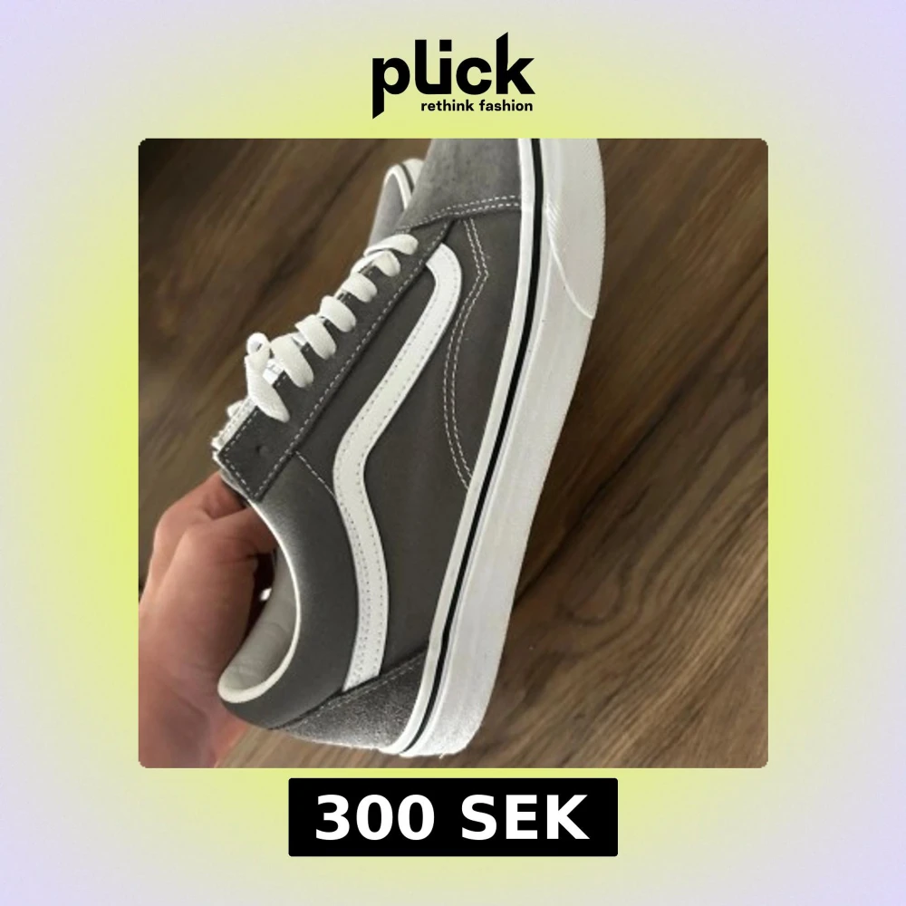 Säljer ett par klassiska Vans Old Skool sneakers i grått med vit sula och vit sidostrip. Skorna har snörning, rund tå och är tillverkade i canvas och mocka. Perfekta för dig som gillar en clean och tidlös streetstil.