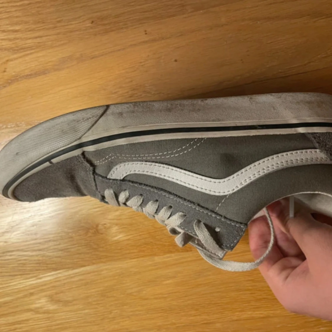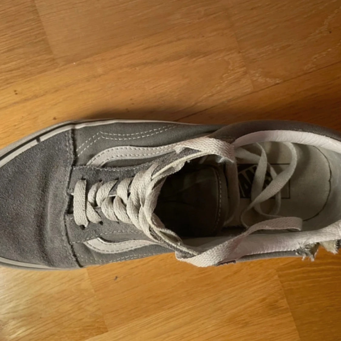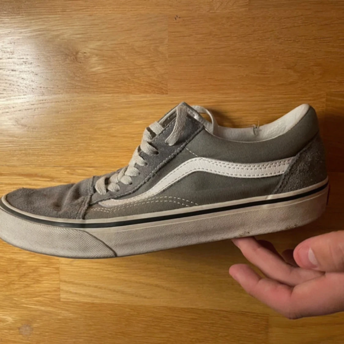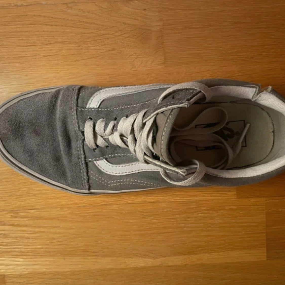 Klassiska Vans Old Skool sneakers i grå mocka och canvas med vit sidostripe och vita snören. Skorna har en platt sula och rund tå, perfekt för en avslappnad streetstil. Snygga kontrastsömmar och ikonisk design.