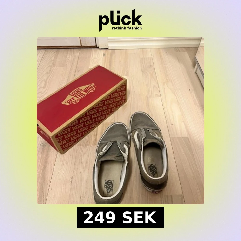 Säljer ett par gråa Vans sneakers med vit sula och klassisk snörning. Skorna har en stilren design med Vans-logga på sidan och är perfekta för vardagsbruk.
