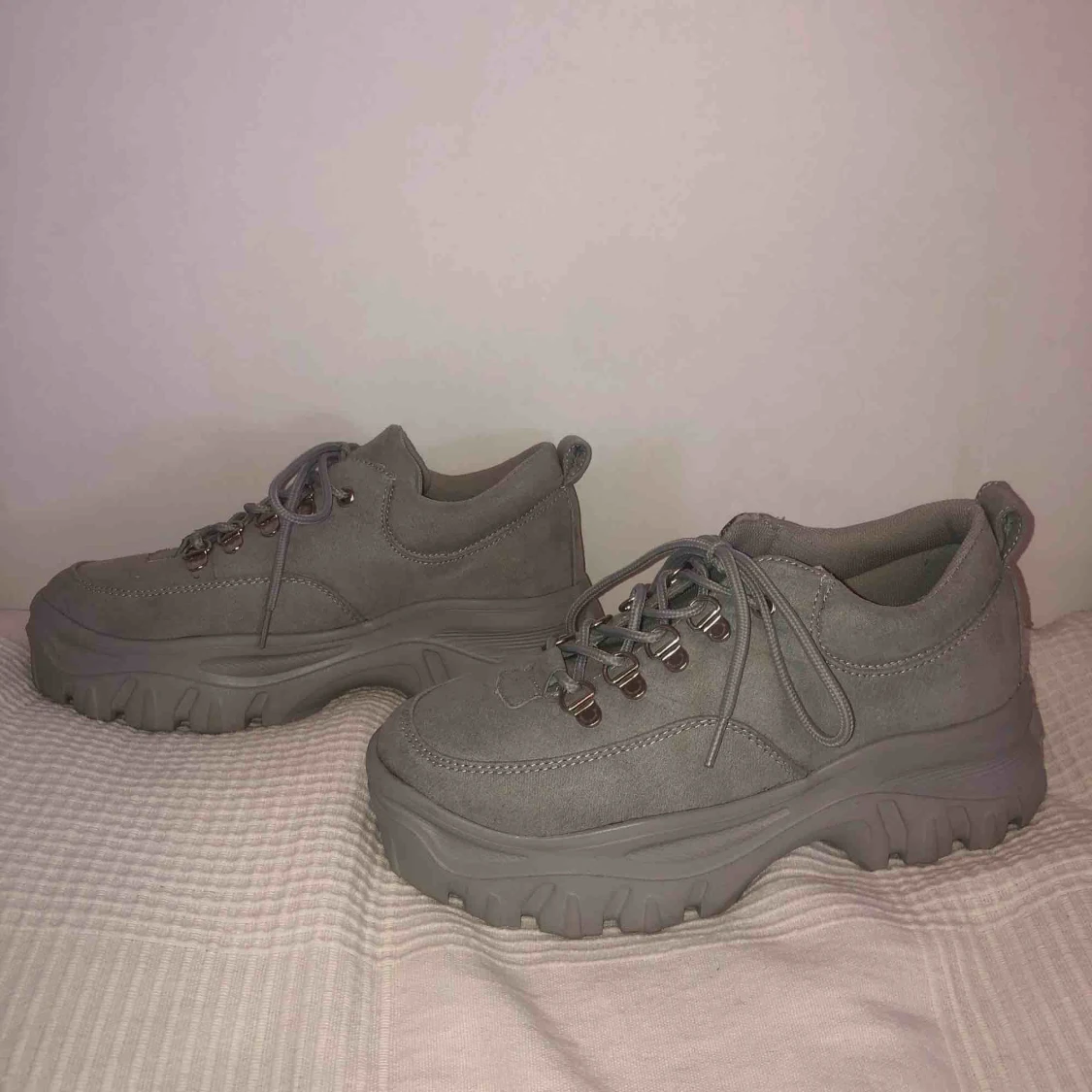 Ett par coola skor i ljusgrått från boohoo i storlek 38! Använda 2 gånger då de är lite försmå för mig som brukar ha 38,5 eller 39. Köparen står för frakten! Priset kan diskuteras!