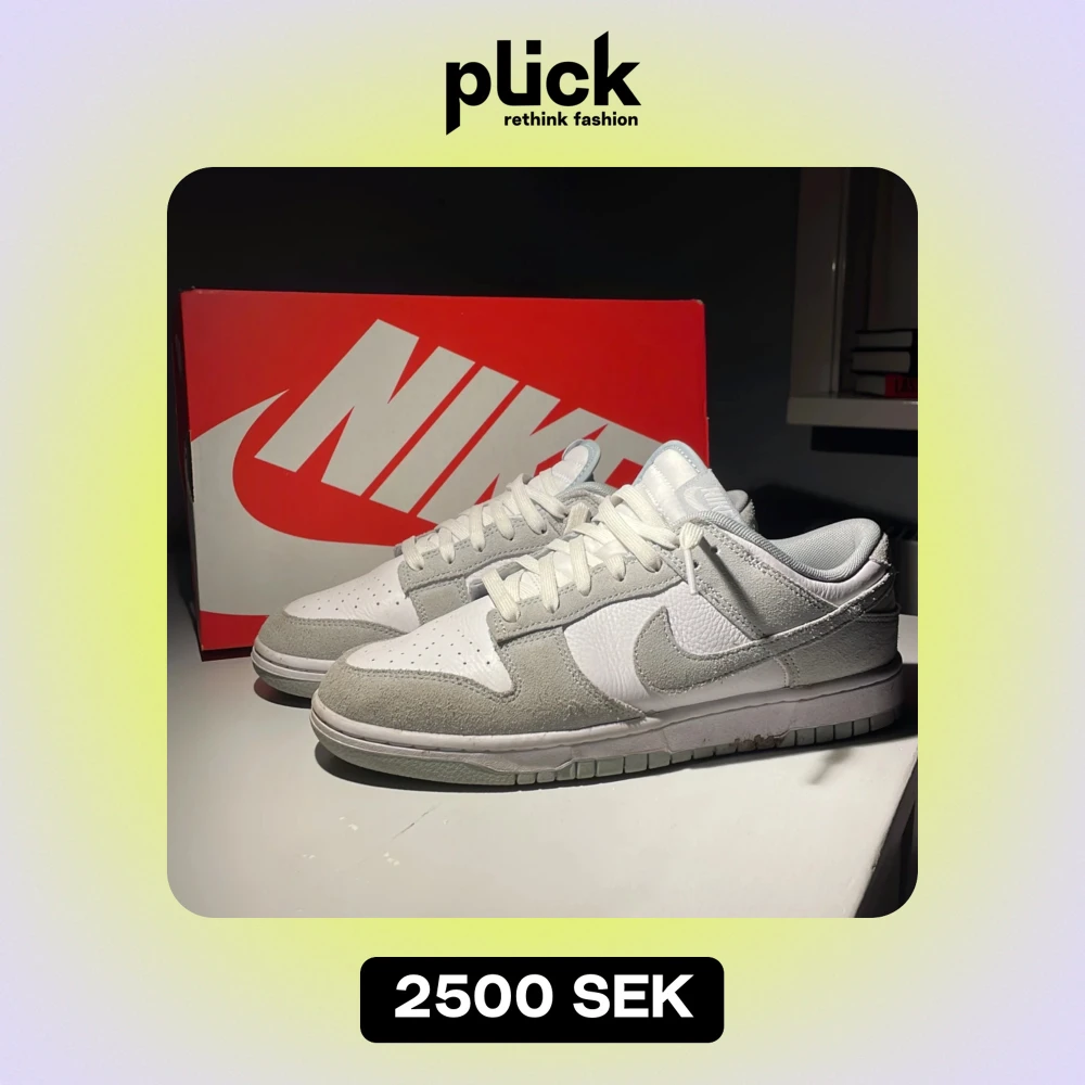 Säljer ett par fräscha Nike Dunk sneakers i vitt och grått. De är i nytt skick och kommer med originalkartong. Perfekta för både vardag och träning. Skorna har en snygg kombination av skinn och mocka med klassisk snörning.