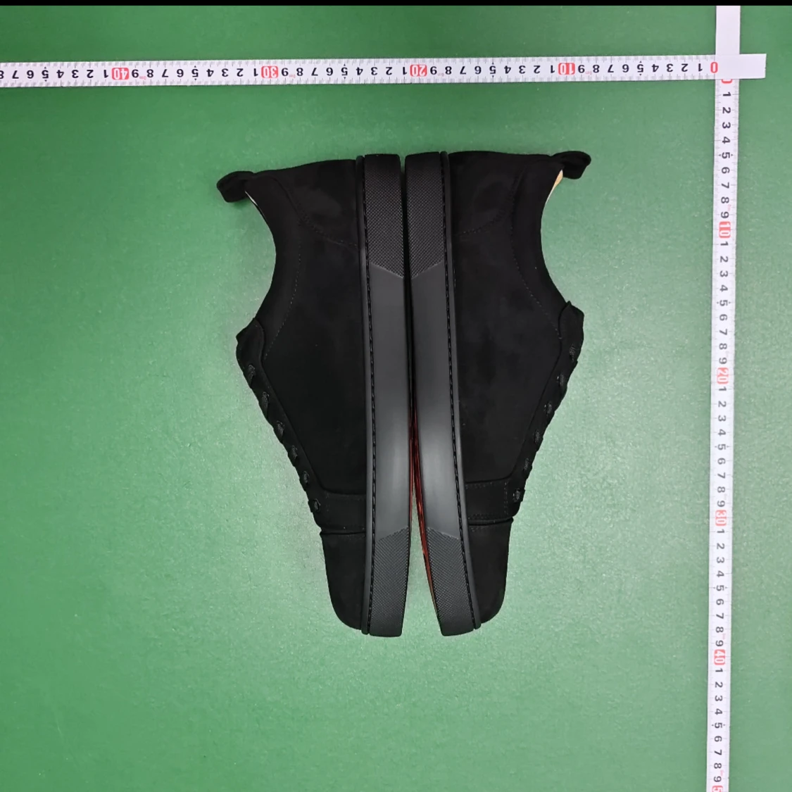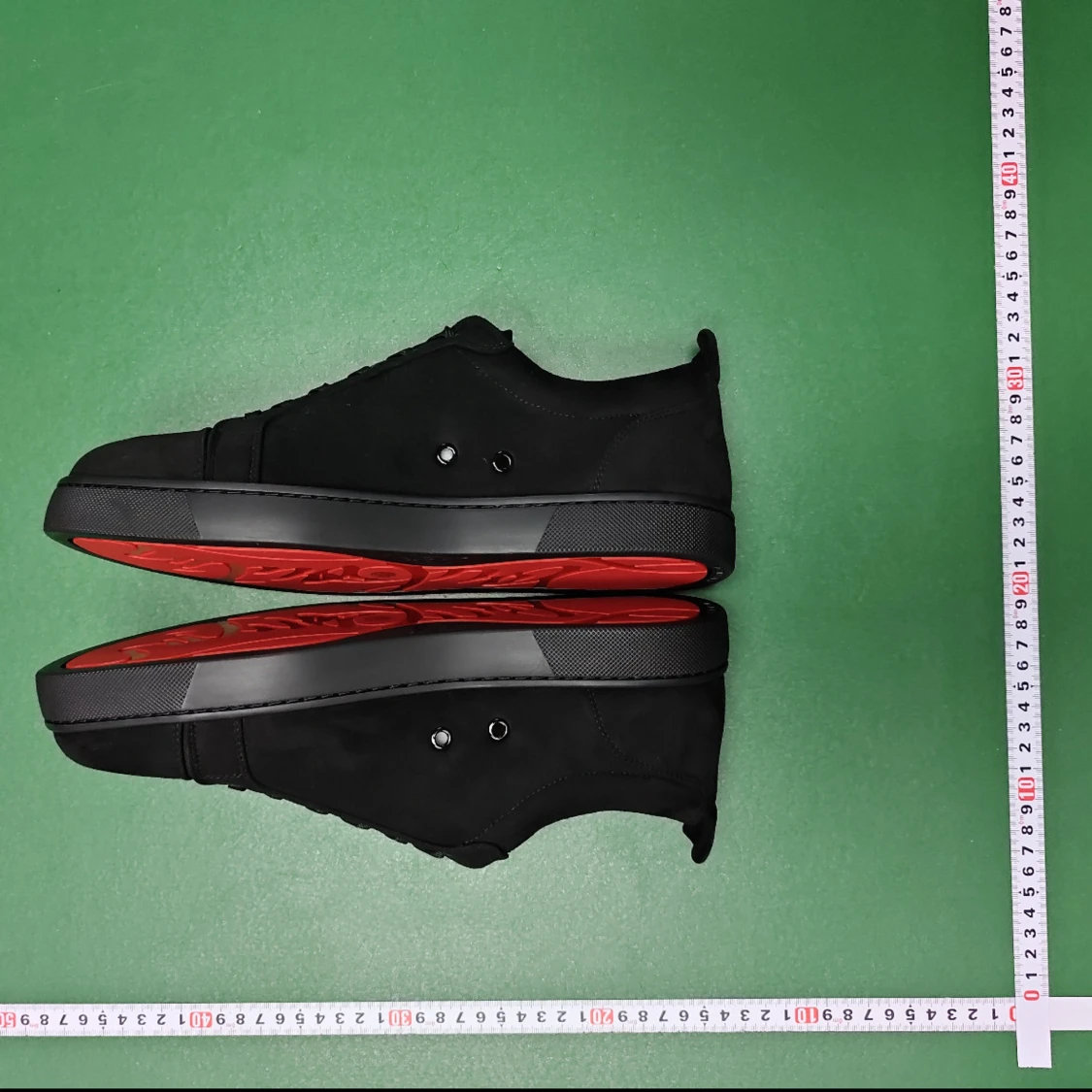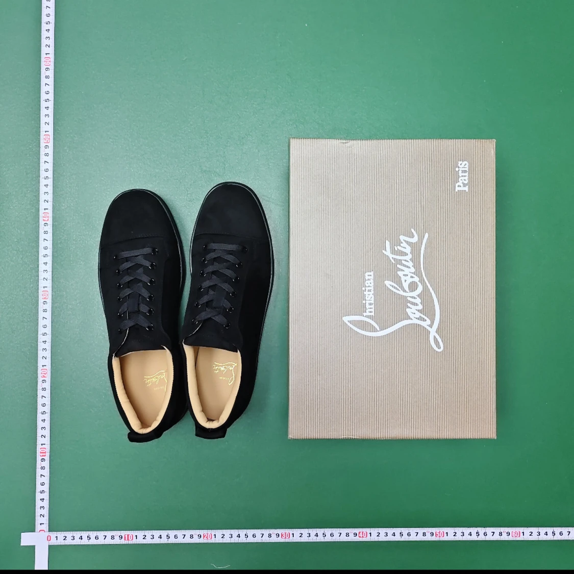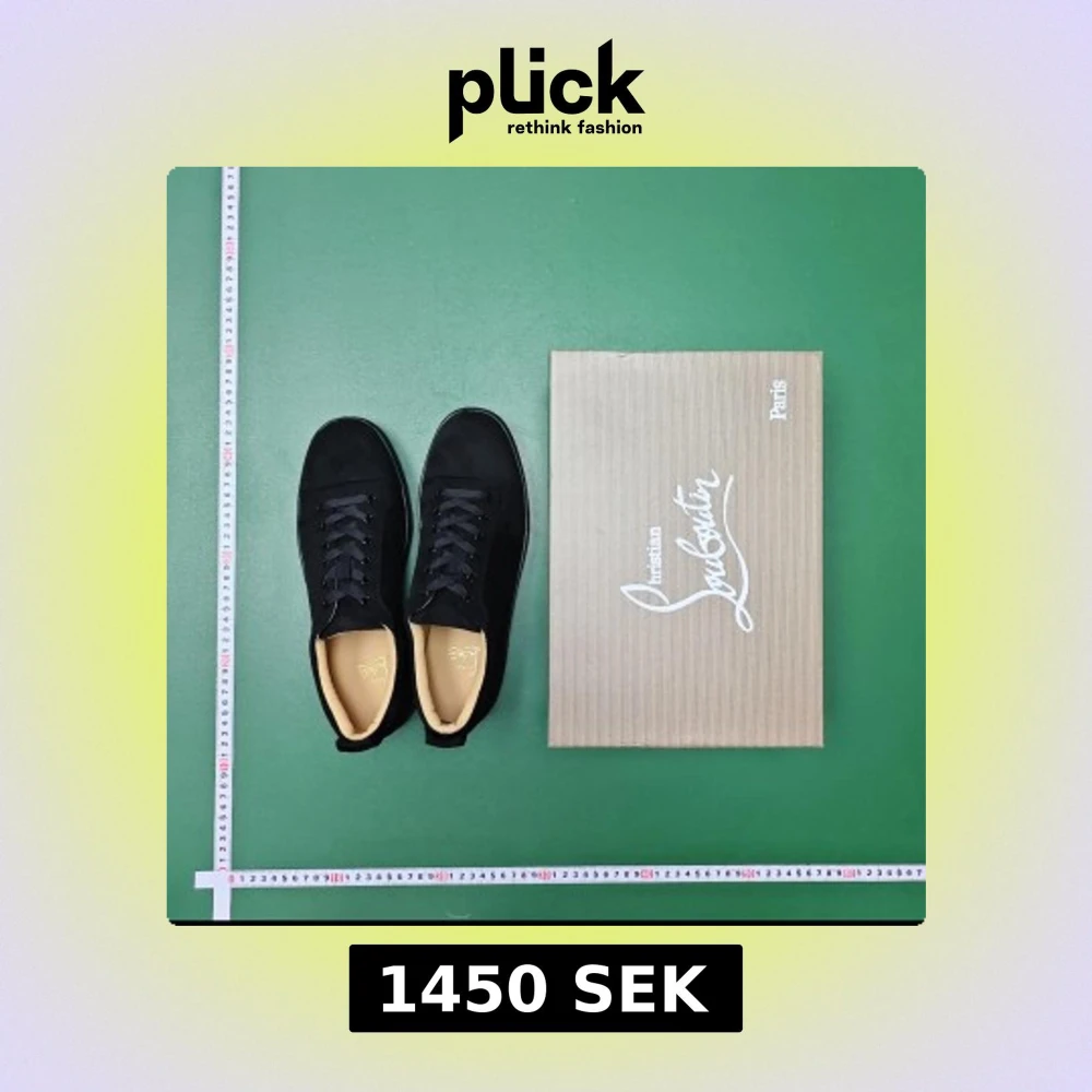 Säljer ett par svarta sneakers från Christian Louboutin i storlek 45. Skorna har en stilren design med rund tå, snörning och platt sula. Ovandelen är i mjuk mocka och insidan är beige. Yttersulan är röd, vilket är Louboutins signatur. Box medföljer.