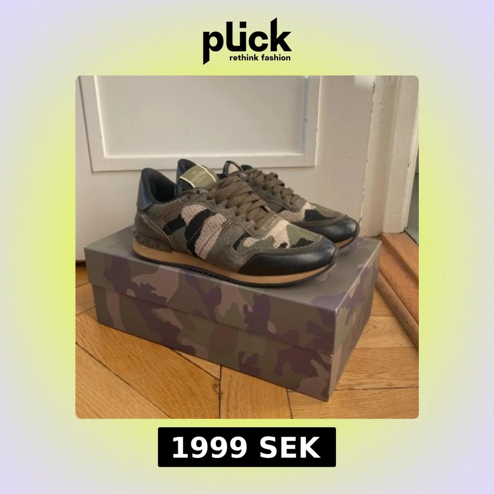 Säljer ett par Valentino Rockrunner sneakers med grön, beige och svart camouflage-mönster. Skorna har snörning, platt sula och detaljer i mocka, mesh och skinn. Ikoniska nitar vid hälen och rund tå. Kommer med originalkartong och extra skosnören.