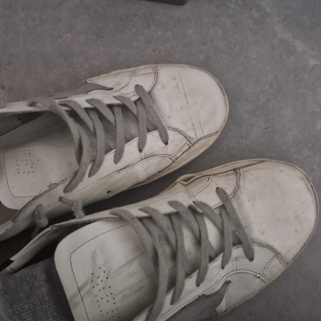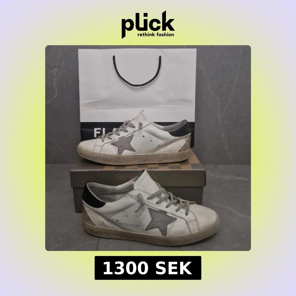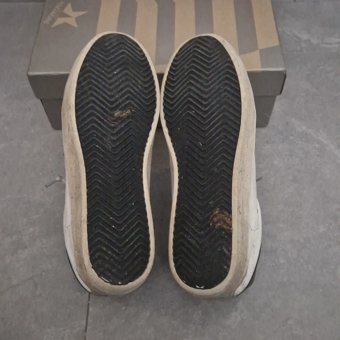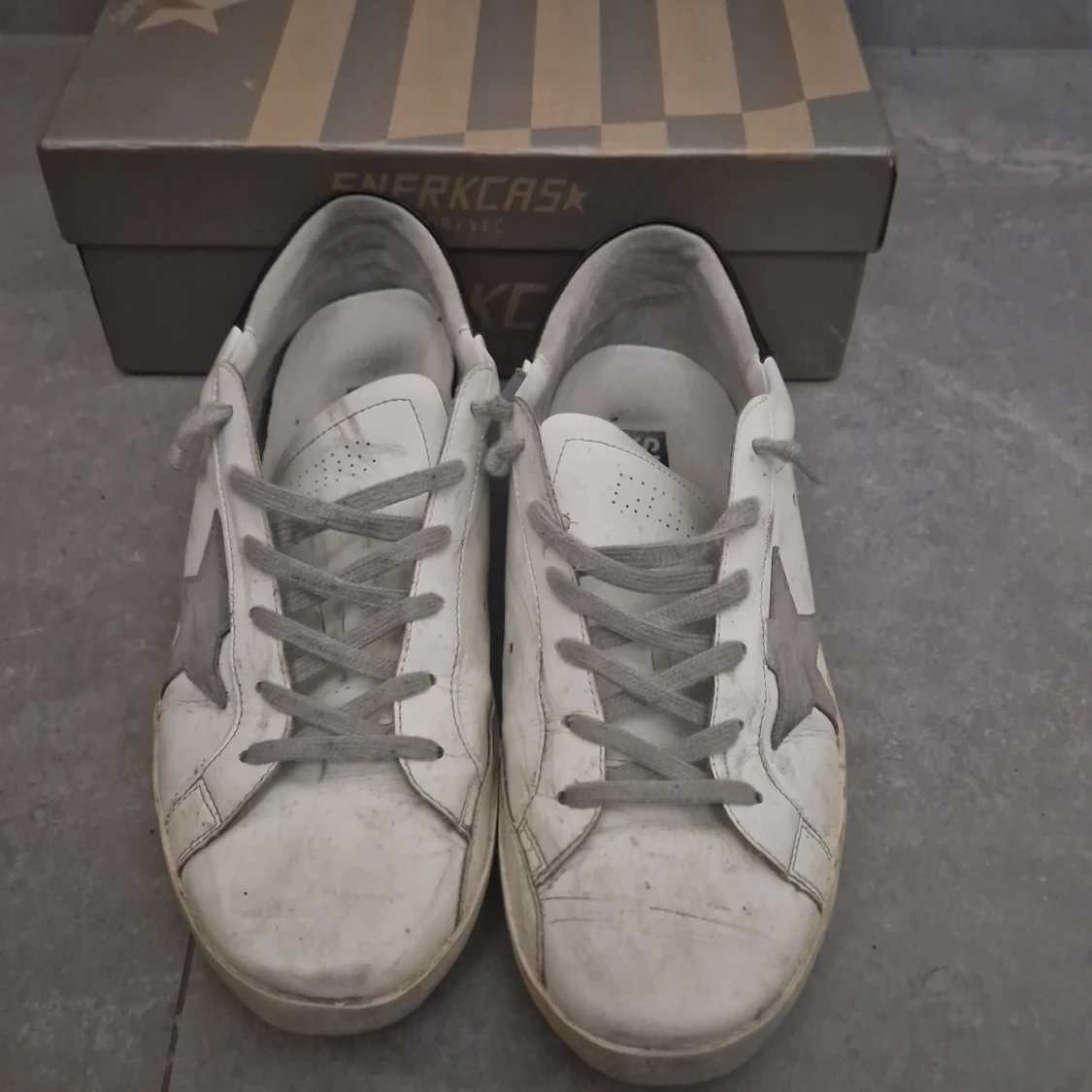 Golden Goose sneakers i vitt skinn med grå stjärndetalj på sidan och svart hälparti med logotyp. Skorna har grå snörning, rund tå och platt sula. Snyggt slitna för en cool streetstil. Perfekt för dig som gillar exklusiva sneakers med unik design.