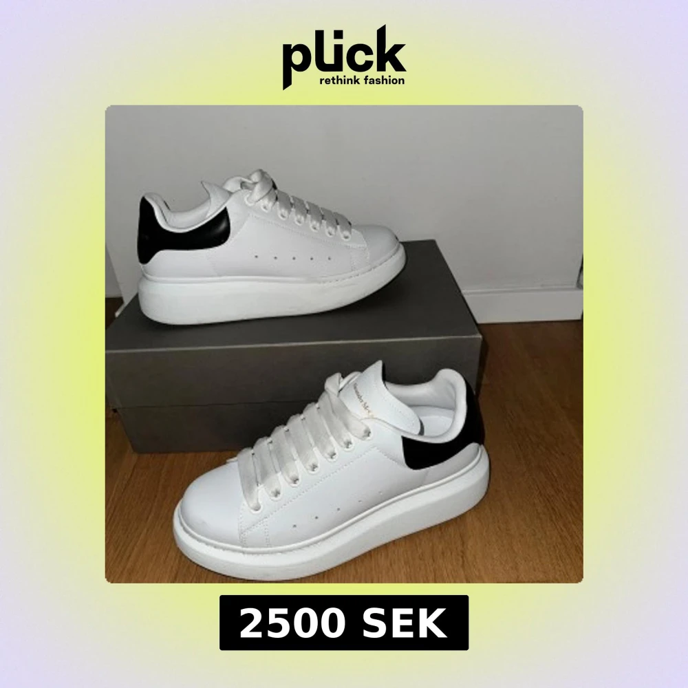 Snygga vita sneakers från Alexander McQueen med svart detalj på hälen. Skorna har en klassisk design med snörning och en tjock sula för extra komfort. Perfekta för en stilren look. Köpt för 5300kr. Sko lådan är tyvärr borttappat. Fick som present och är knappast använd som man ser på bilden. Kan sälja den billigare vid snabb affär.