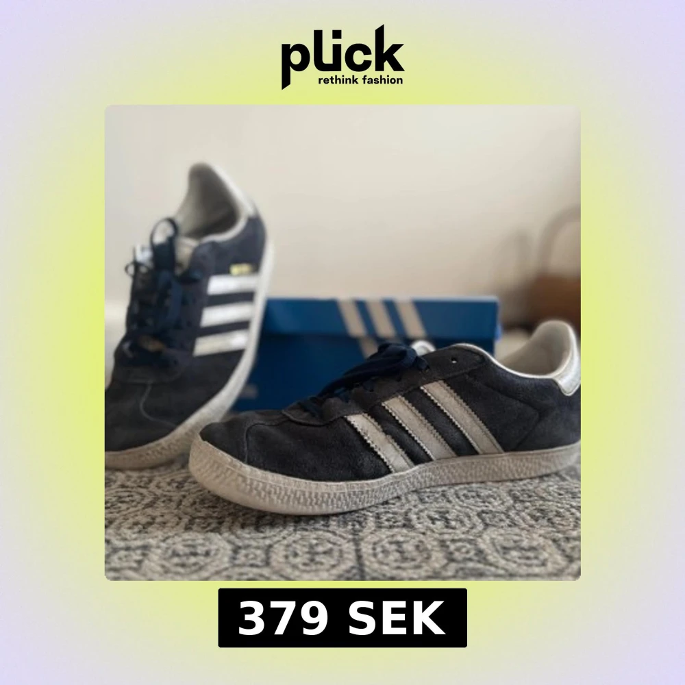 Säljer ett par klassiska Adidas Gazelle sneakers i mörkblå mocka med vita skinnränder och vit sula. Skorna har snörning och rund tå, samt den ikoniska Gazelle-loggan i guld på sidan. Perfekt för dig som gillar retrostil och streetwear.