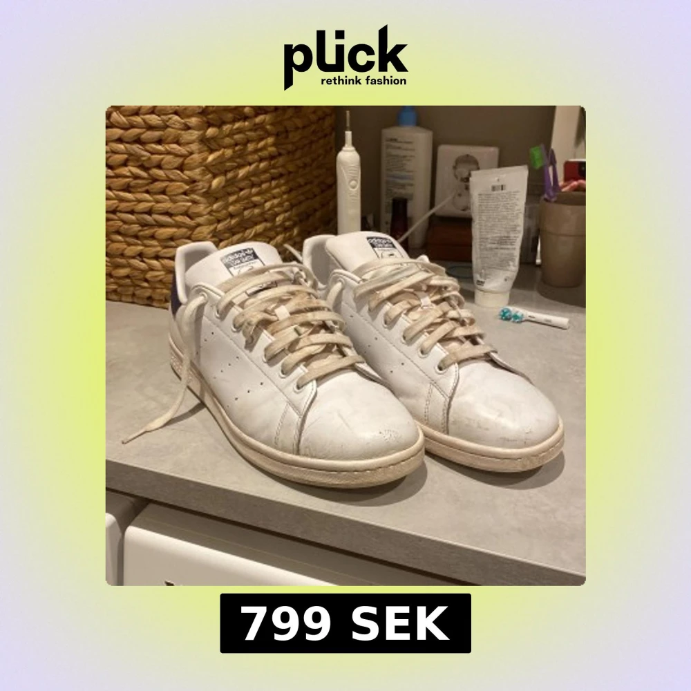 Klassiska Adidas Stan Smith sneakers i vitt skinn med mörkblå detalj på hälen och perforerade ränder på sidorna. Skorna har snörning, platt sula och rund tå. Perfekta för dig som gillar en clean och tidlös look. Skick 8.5/10 lite smuts här å där följer tyvärr inte med någon box