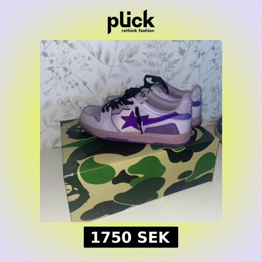 Helt oanvända! Säljer ett par BAPE STA sneakers i lila och mörklila med svart snörning. Skorna har en ikonisk stjärndetalj på sidan och BAPE-logga på hälen och sulan. Ovandelen är i syntetmaterial och skinn, med platt sula och rund tå. Kommer med original BAPE camo-låda. Hör av dig vid minsta fundering!😊👍🏼