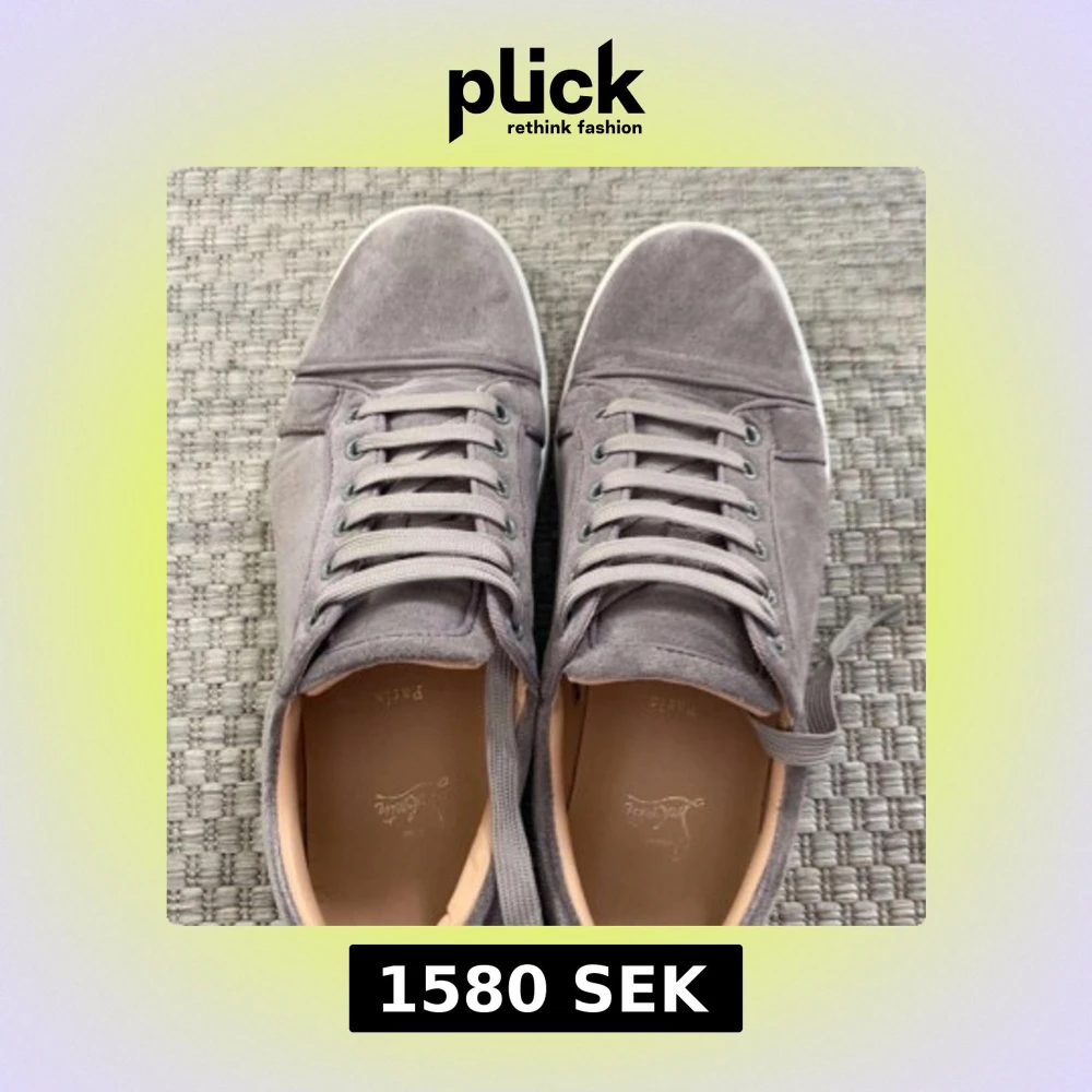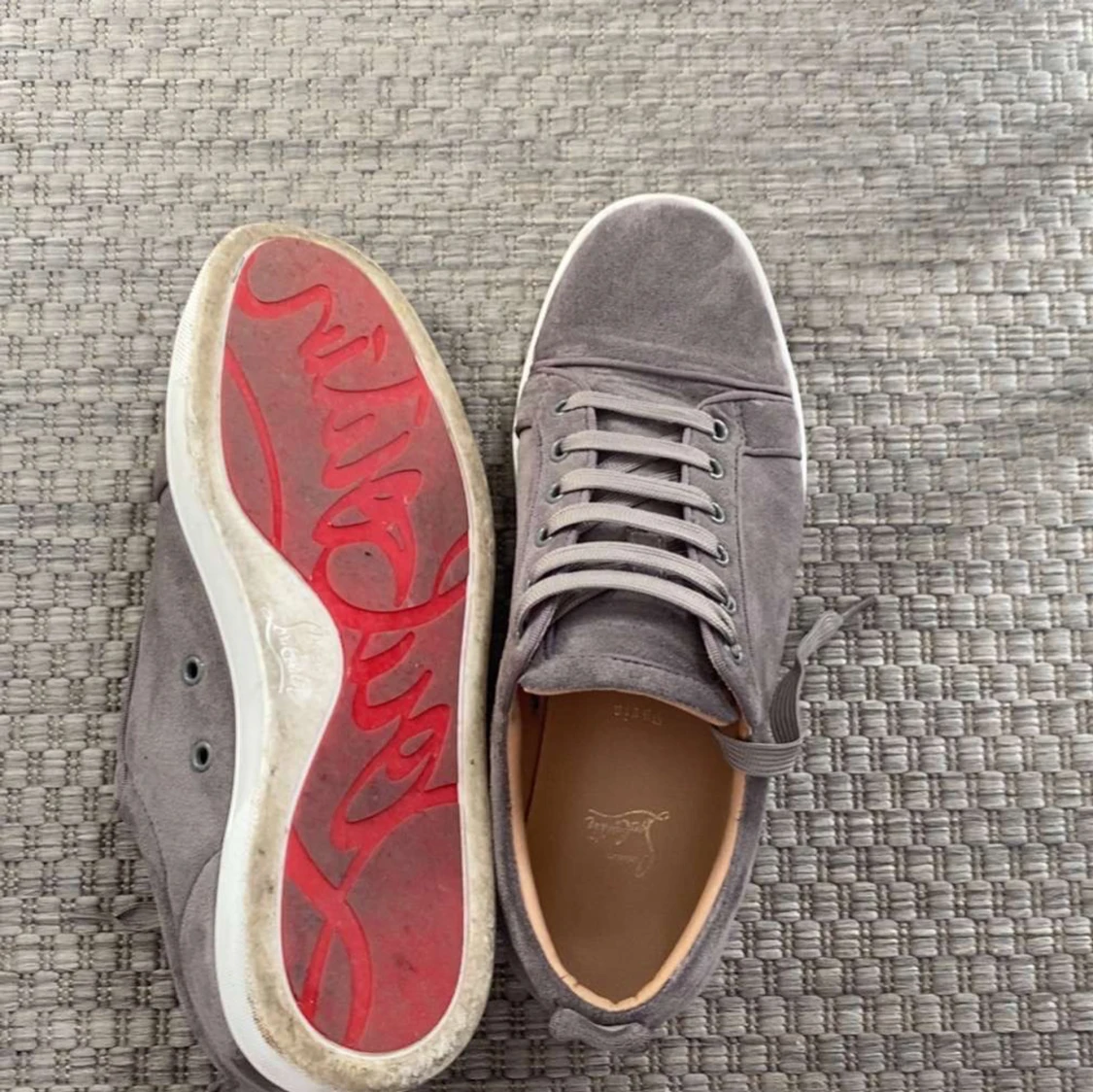 Snygga grå sneakers i mocka med klassisk snörning och rund tå. Skorna har en unik röd sula med mönster, vilket ger dem en exklusiv touch. Perfekta för en stilren look.
