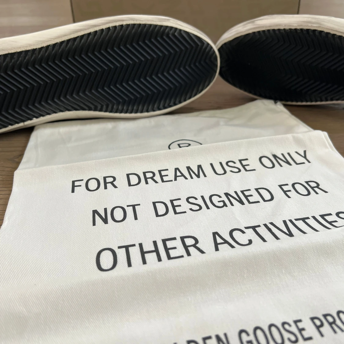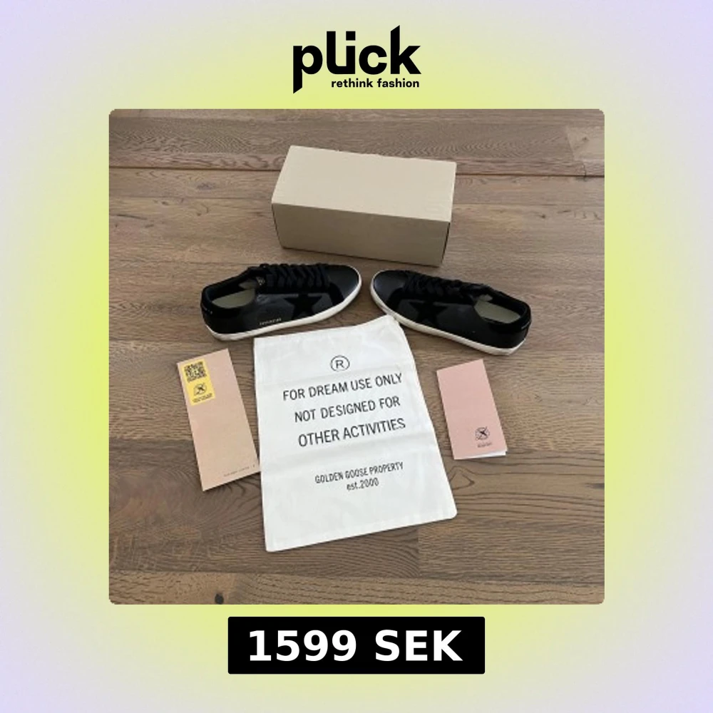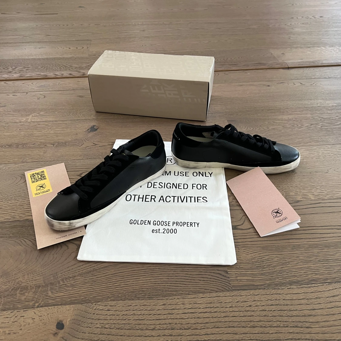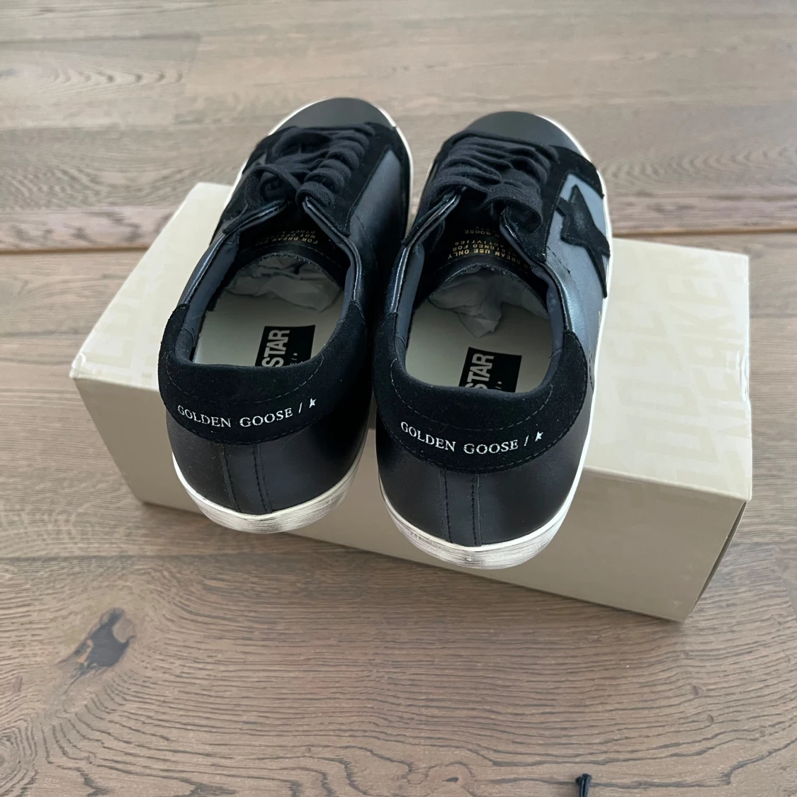 Säljer ett par svarta sneakers från Golden Goose med vit sula och svart stjärndetalj på sidan. Skorna har snörning och klassisk rund tå. Märkeslogga syns baktill. Perfekta för dig som gillar stilrena och trendiga sneakers.