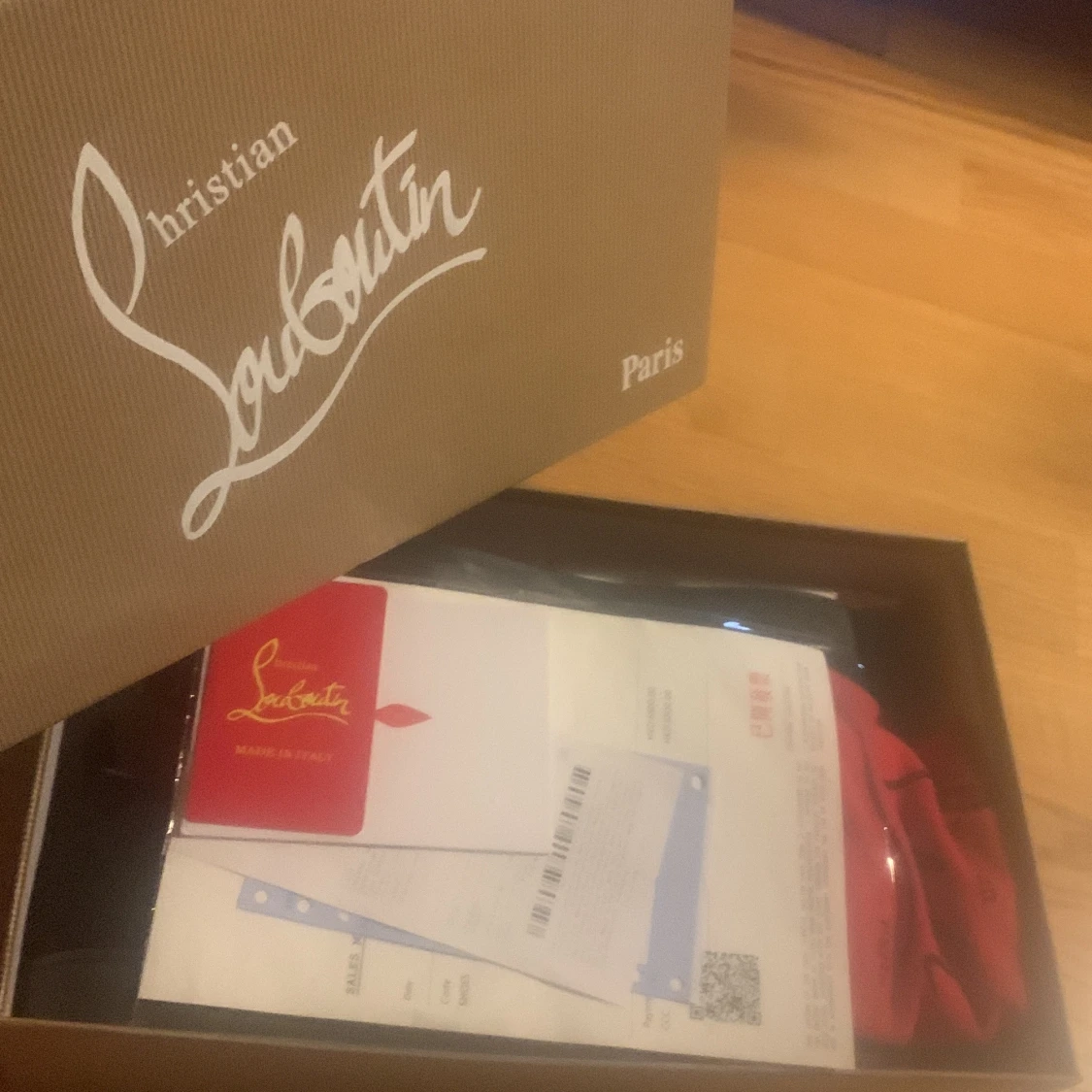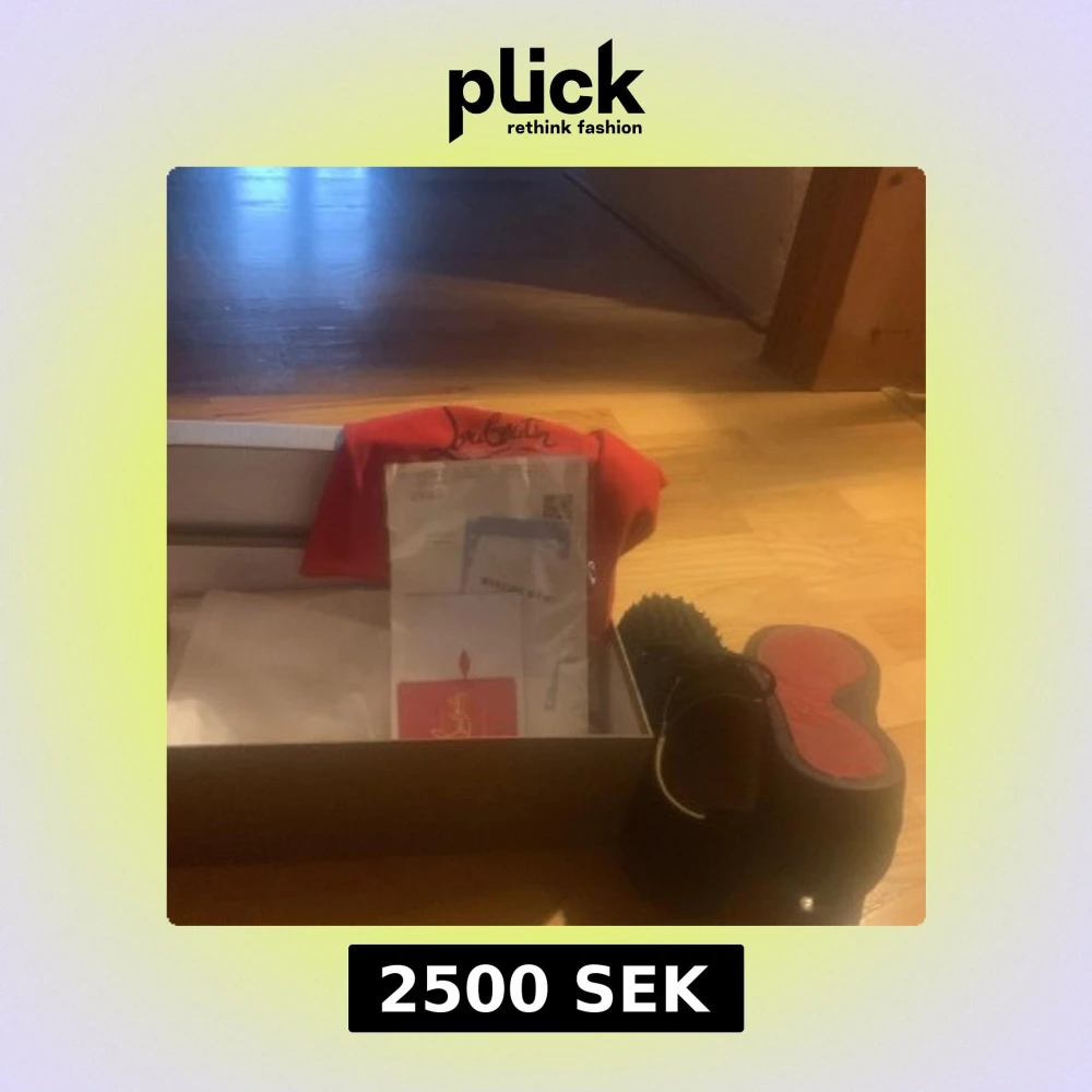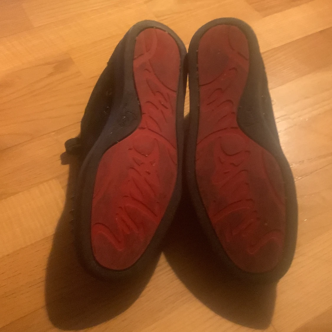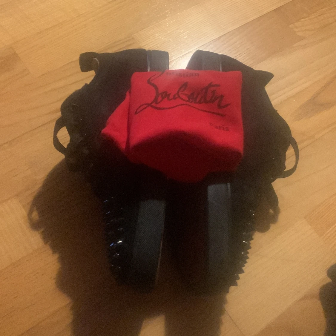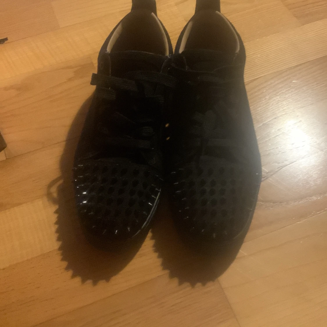 Svarta sneakers från Christian Louboutin med ikoniska röda sulor och svarta nitar på tån. Skorna har snörning och är tillverkade i skinn med en cool, edgy vibe. Perfekta för dig som vill sticka ut med exklusiva detaljer och streetstyle-känsla. Med spikar