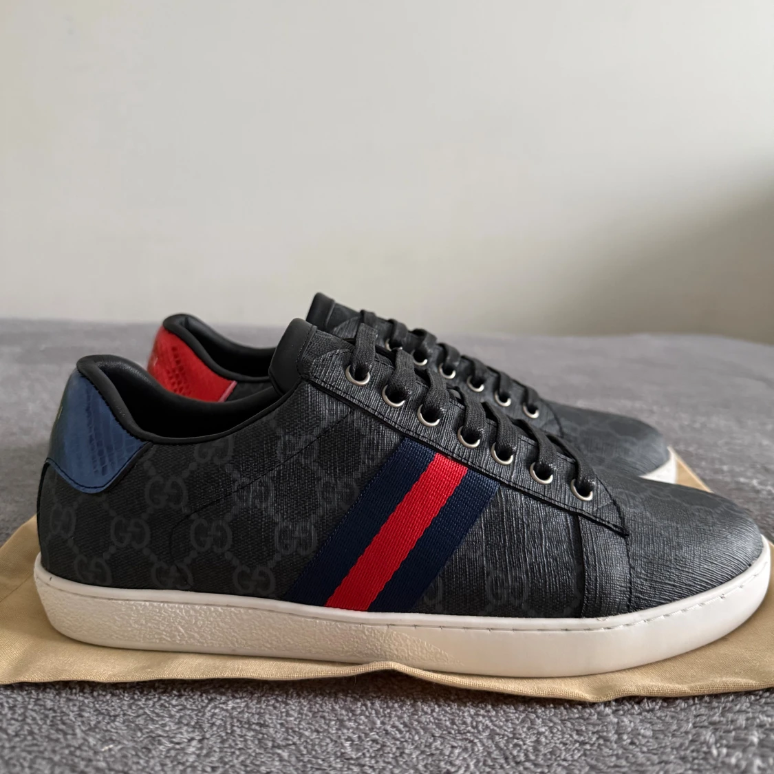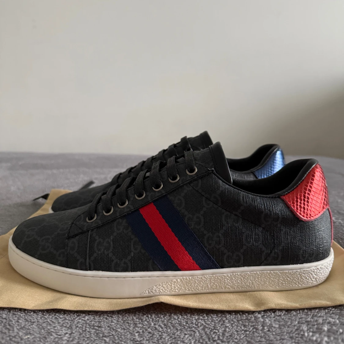 Snygga Gucci sneakers i grå/svart med GG-monogram över hela skon. Sidorna har klassiska röd-blå ränder och hälarna är i matallic röd och blå reptilstruktur med Gucci-logga. Skorna har snörning, platt vit sula och rund tå. Materialet är canvas och skinn.