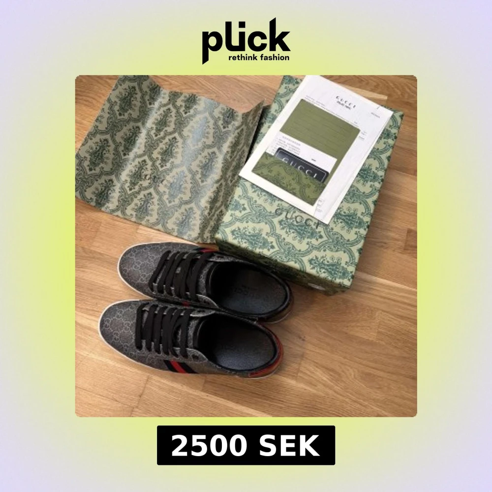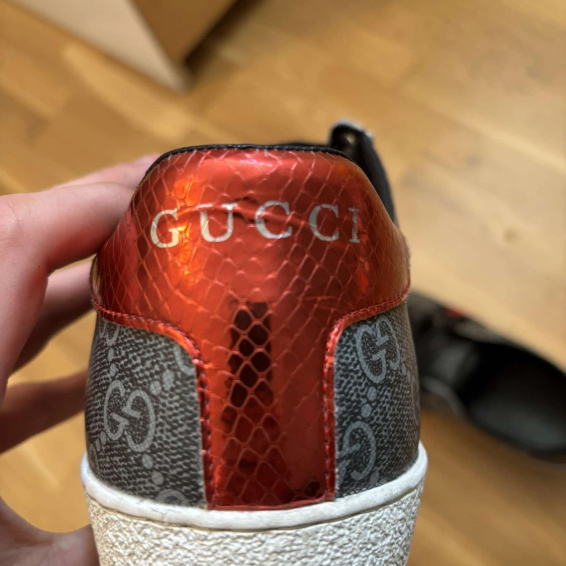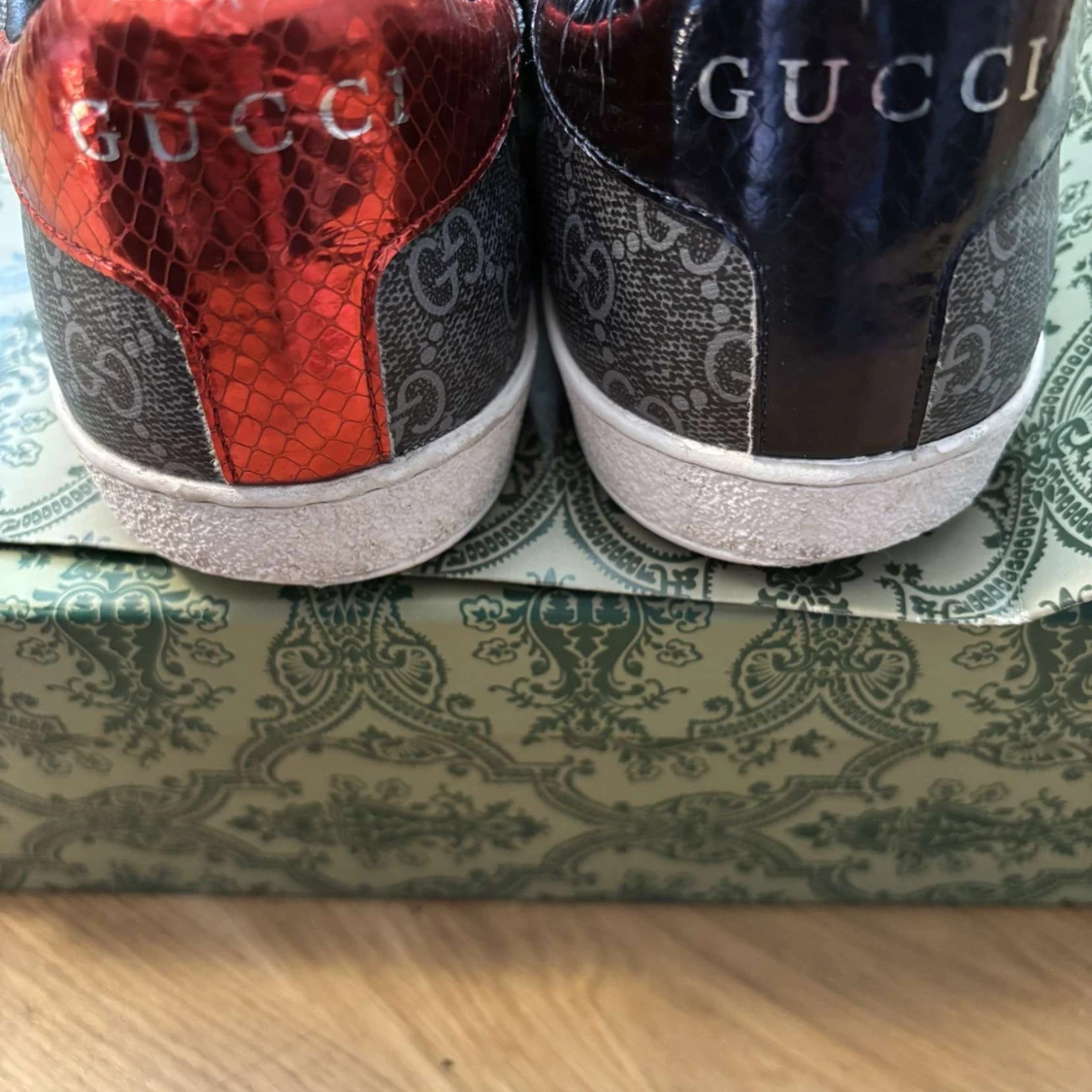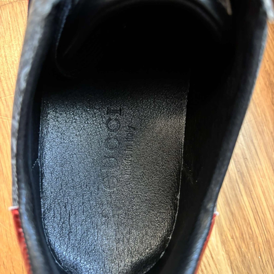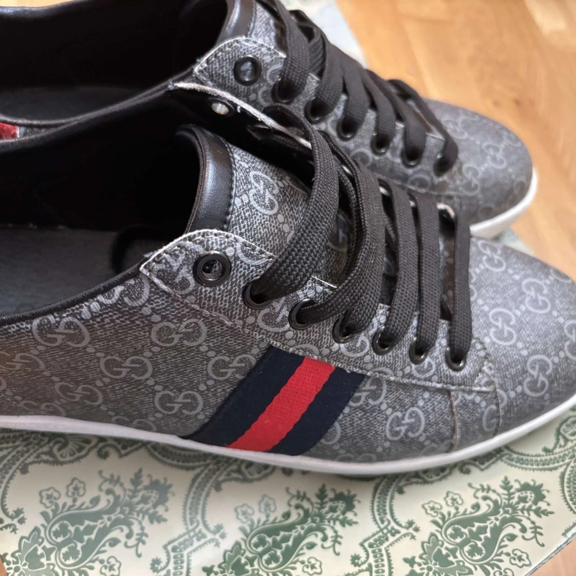 Snygga Gucci sneakers med klassiskt GG-mönster i grått och svart, röda och blå ränder på sidan samt metallicröd detalj med Gucci-logga på hälen. Skorna har svarta snören och vit sula. Tillverkade i skinn och textil för en lyxig känsla.