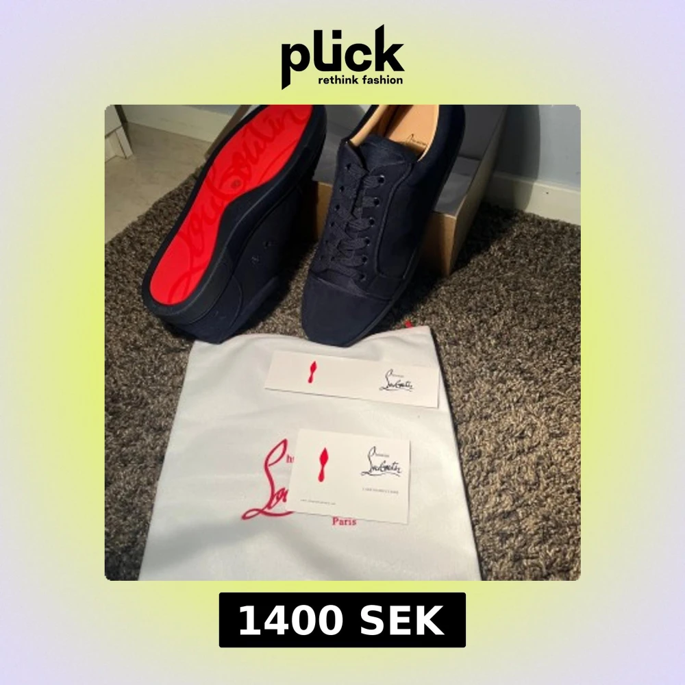 Säljer ett par mörkblå sneakers från Christian Louboutin med klassisk röd sula. Skorna är i mocka och har snörning samt rund tå. Märkets logga är broderad på hälen. Perfekta för dig som vill ha något exklusivt och stilrent.