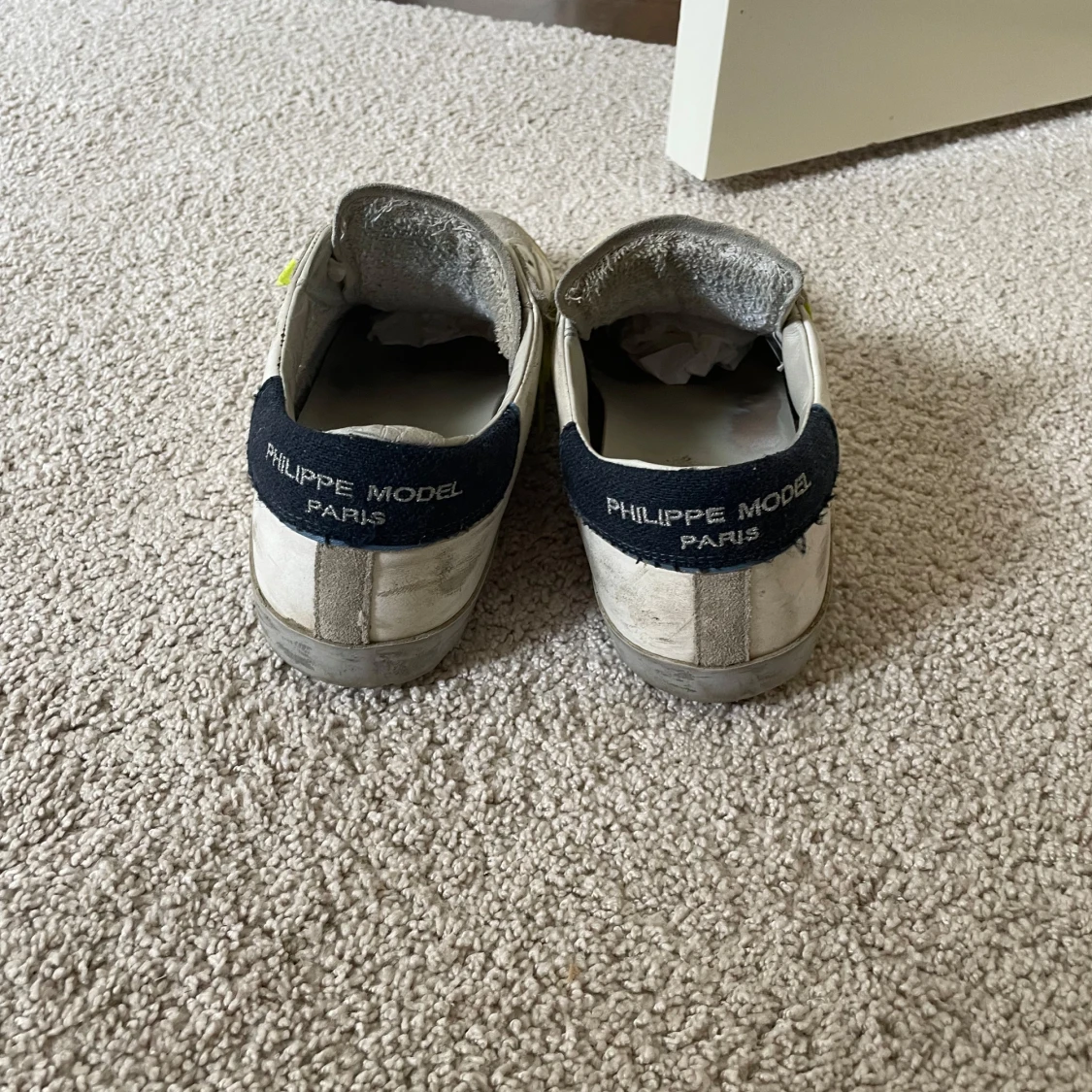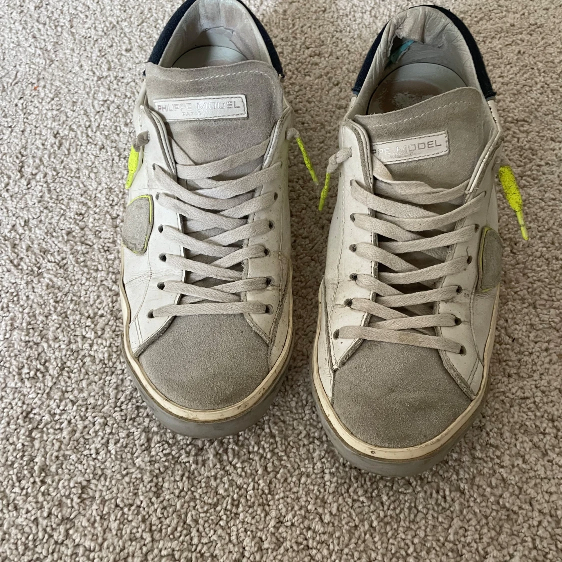Snygga vita Philippe model skor med gula detaljer på snörena och loggan, använda ett antal gånger men har fortfarande mycket att ge skick runt 7/10 kan gå ner lite i priset. Skriv om frågor