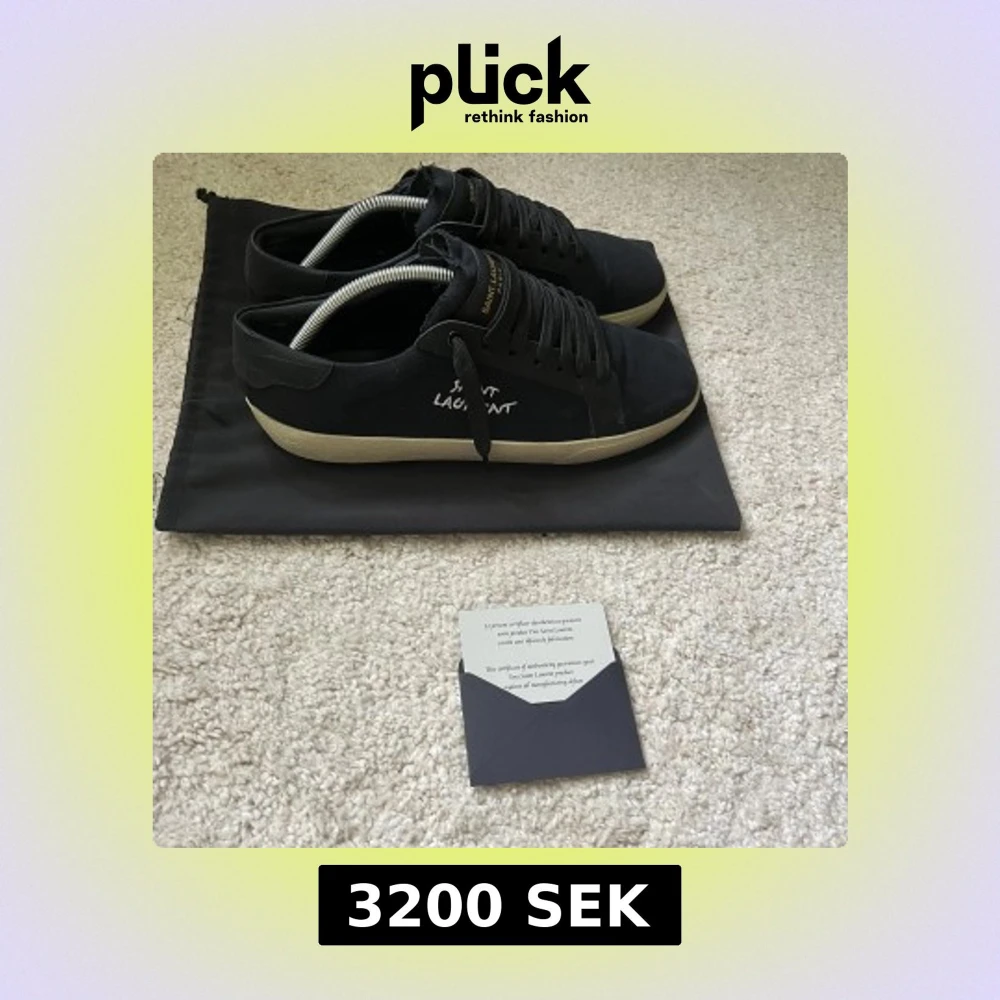 Snygga svarta sneakers från Saint Laurent med vit text på sidan och gulddetaljer på plösen. Skorna har en klassisk låg profil, svarta snören och en beige platt sula. Ovandelen är i canvas och detaljer i skinn. Perfekta för dig som gillar stilrena och exklusiva sneakers. Box, dustbag och certifikations kort ingår. Skorna är str 44 men passar i 44 1/2