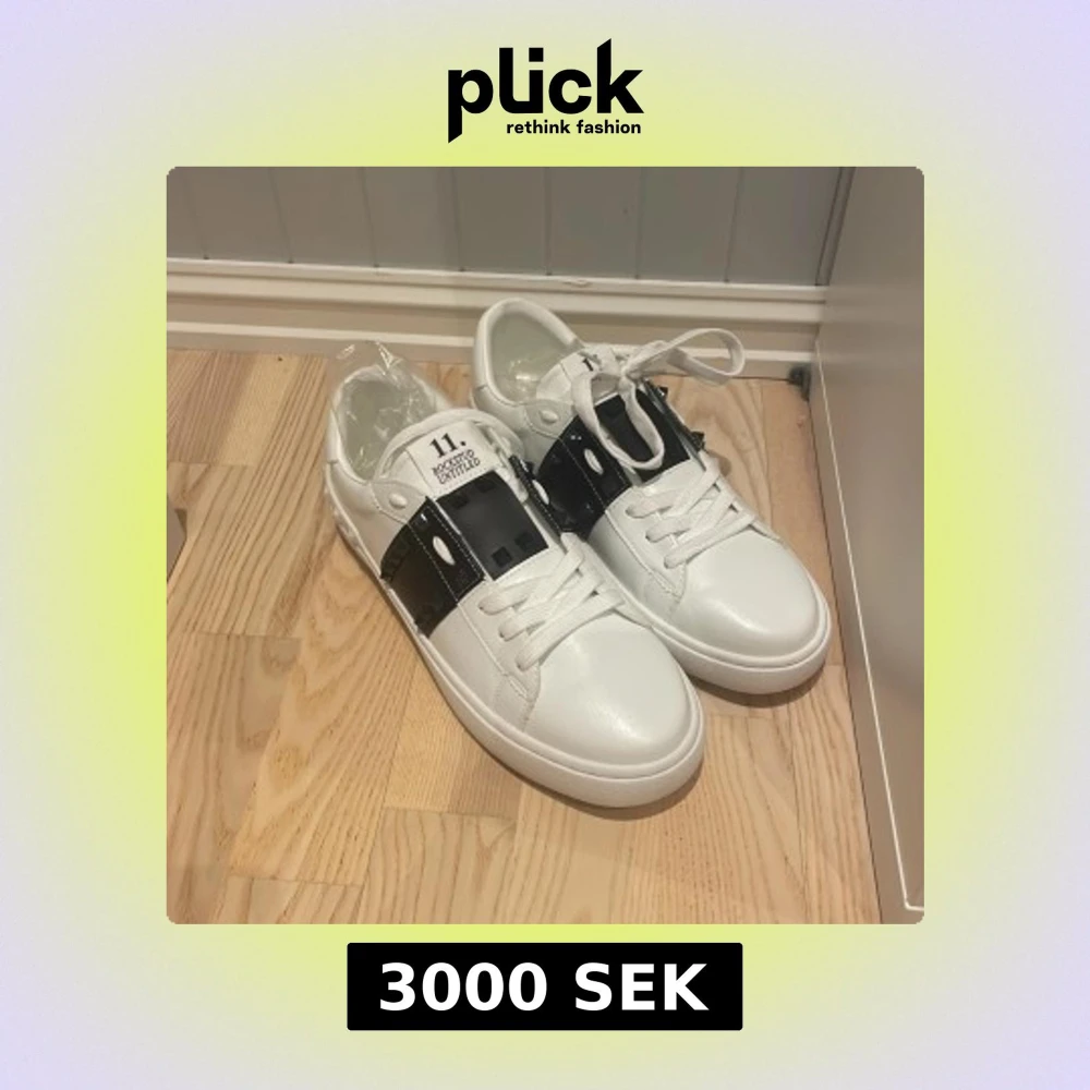 Snygga vita sneakers från Valentino Garavani Rockstud 11. med svarta detaljer och snörning. Skorna har en unik design med nitar på hälen och en bred rem över vristen. Perfekta för att ge din outfit en lyxig touch. De är storlek 43 och kommer med påse och dammpåsar.