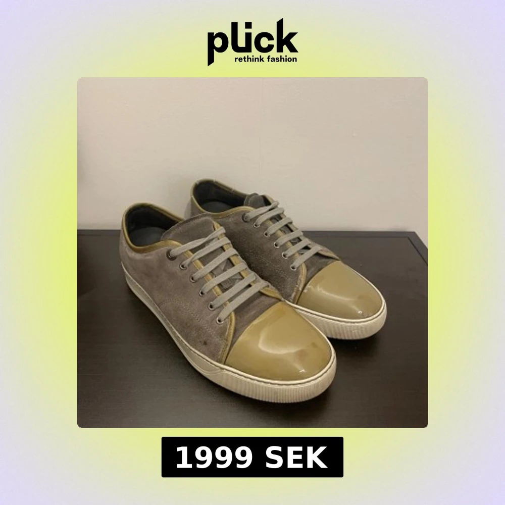 Snygga grå sneakers från Lanvin med en unik design. Skorna har en kombination av mocka och glansigt material på tån. De har grå snörning och en vit sula som ger en stilren look. Perfekta för dig som vill ha något stilrent men ändå unikt. Skriv om ni har funderingar eller vill köpa, priset är inte hugget i sten!