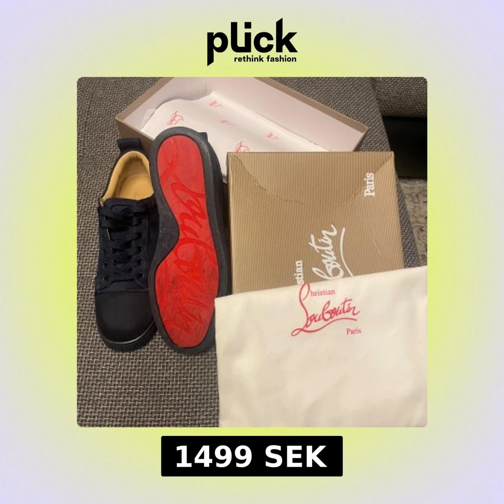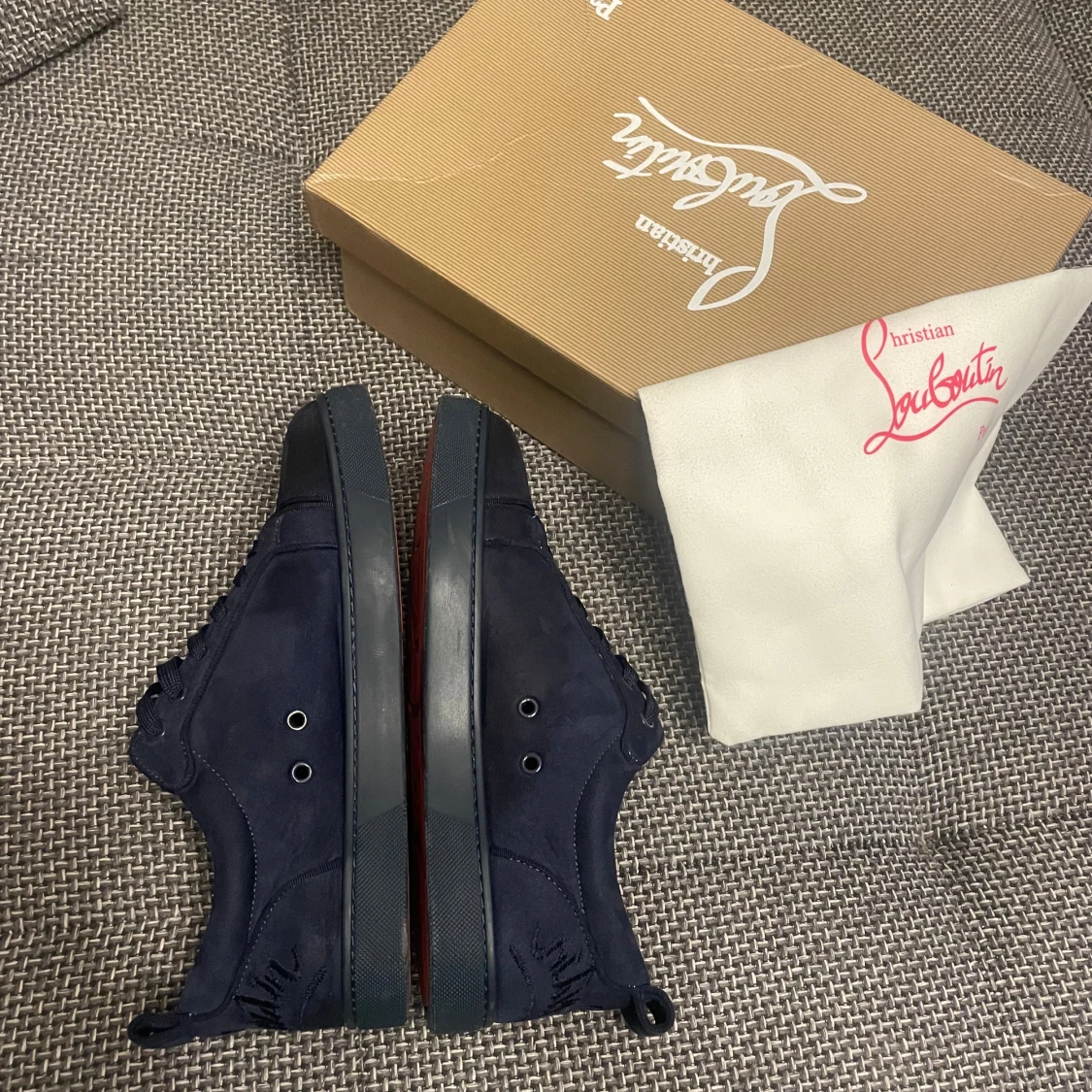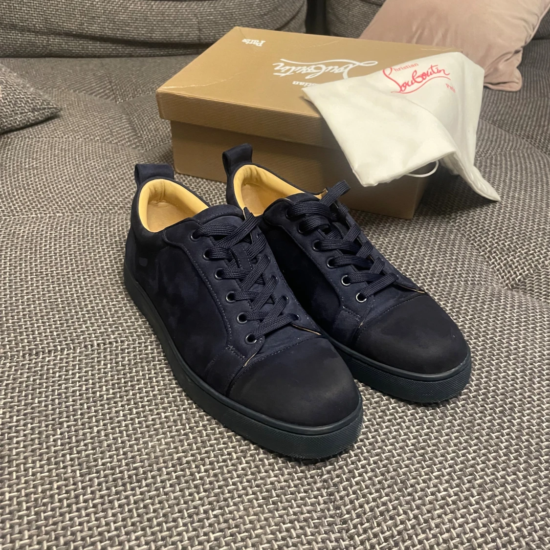 Snygga svarta sneakers från Christian Louboutin med ikonisk röd sula och diskret logga på sidan. Skorna är i mocka med svarta snören och har en klassisk rund tå. Insidan är beige och de levereras med originalkartong och dustbag.